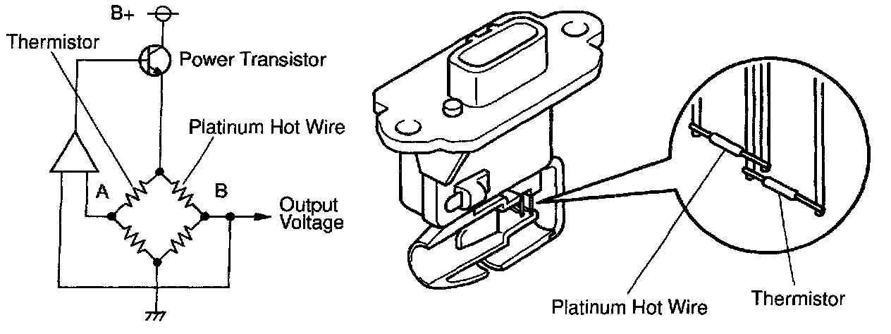 The mass air flow meter uses a platinum hot wire. The hot wire air flow meter consists of a platinum hot wire, thermistor and a control circuit installed in a plastic housing. The hot wire air flow meter works on the principle that the hot wire and thermistor located in the intake air bypass of the housing detect any changes in the intake air temperature.
