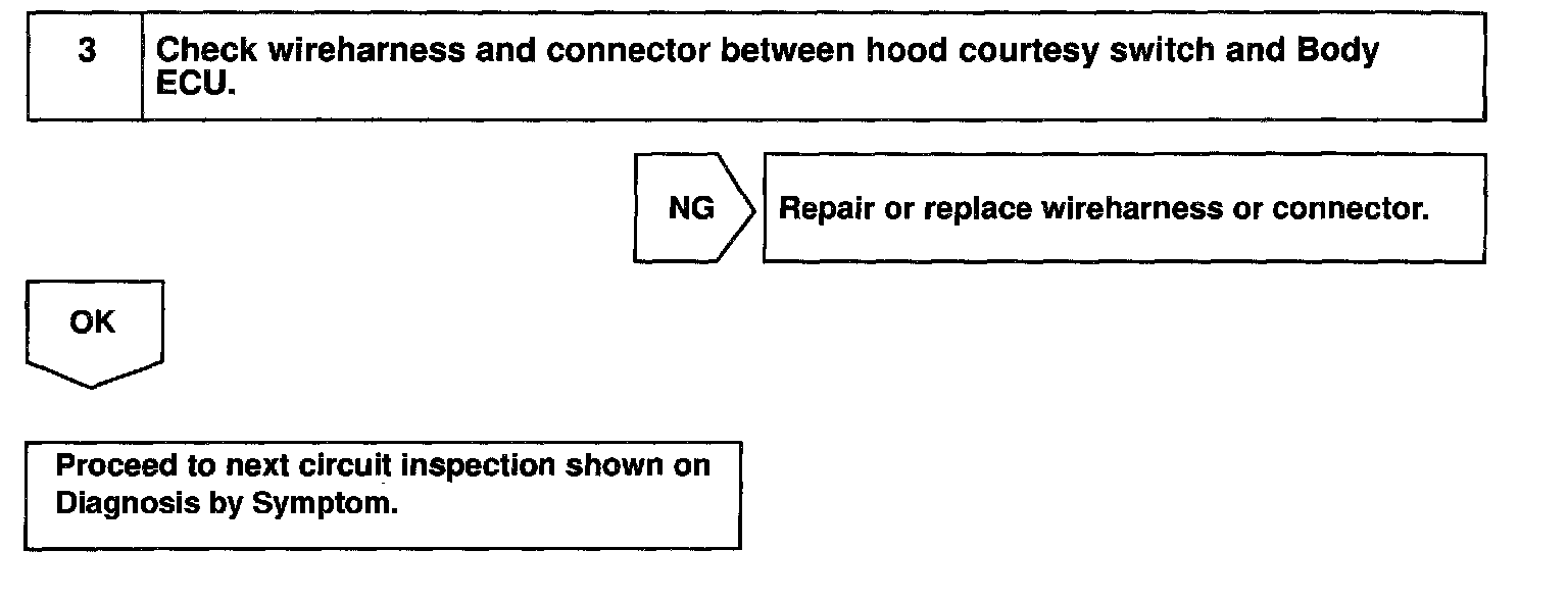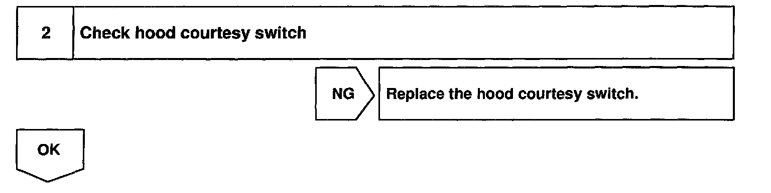CIRCUIT DESCRIPTIONThe hood courtesy switch is built into the engine hood lock assembly and goes on when the engine hood is opened and goes off when the engine hood is closed.
