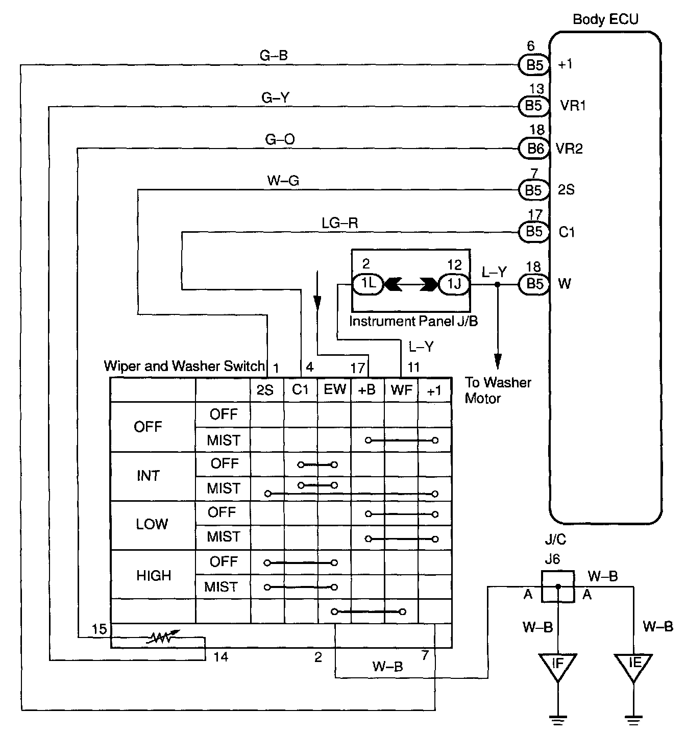 CIRCUIT DESCRIPTIONBody ECU judges the switch position with the terminal voltage of the wiper and washer switch and runs the wiper motor.