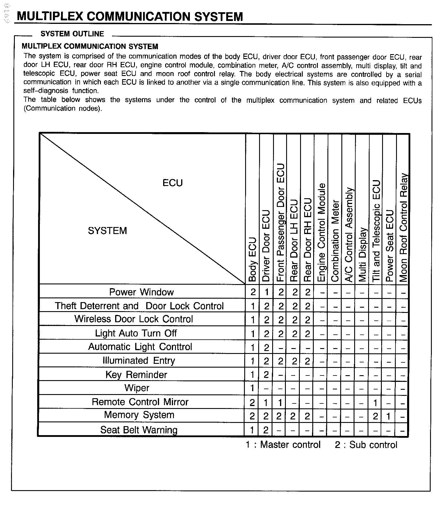 MULTIPLEX COMMUNICATION SYSTEMThe system is comprised of the communication modes of the body ECU, driver door ECU, front passenger door ECU, rear door LH ECU, rear door RH ECU, engine control module, combination meter, A/C control assembly, multi display, tilt and telescopic ECU, power seat ECU and moon roof control relay. The body electrical systems are controlled by a serial communication in which each ECU is linked to another via a single communication line. This system is also equipped with a self-diagnosis function.