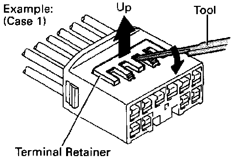 HINT: To remove the terminal from the connector, please construct and use the special tool or like object shown on the left.
