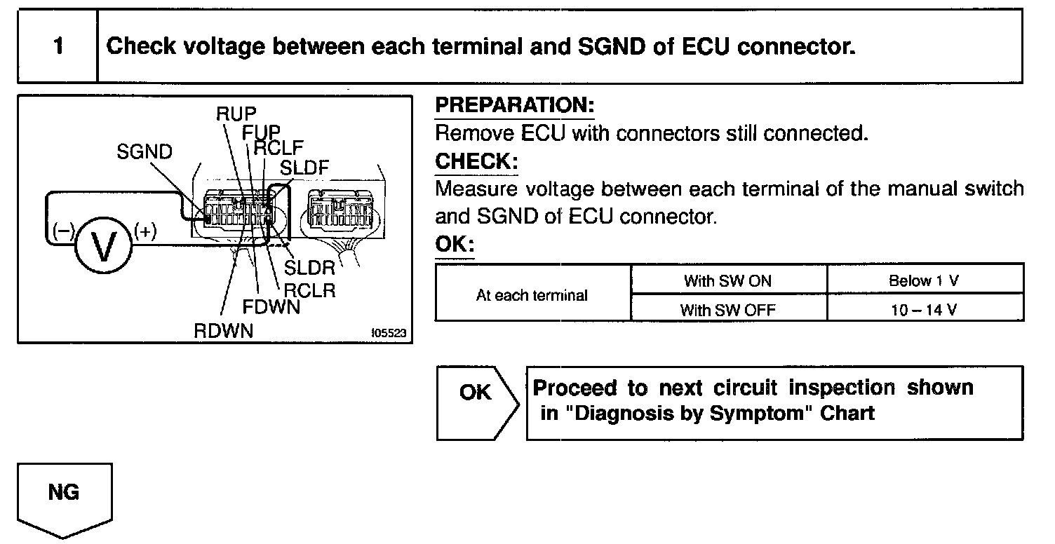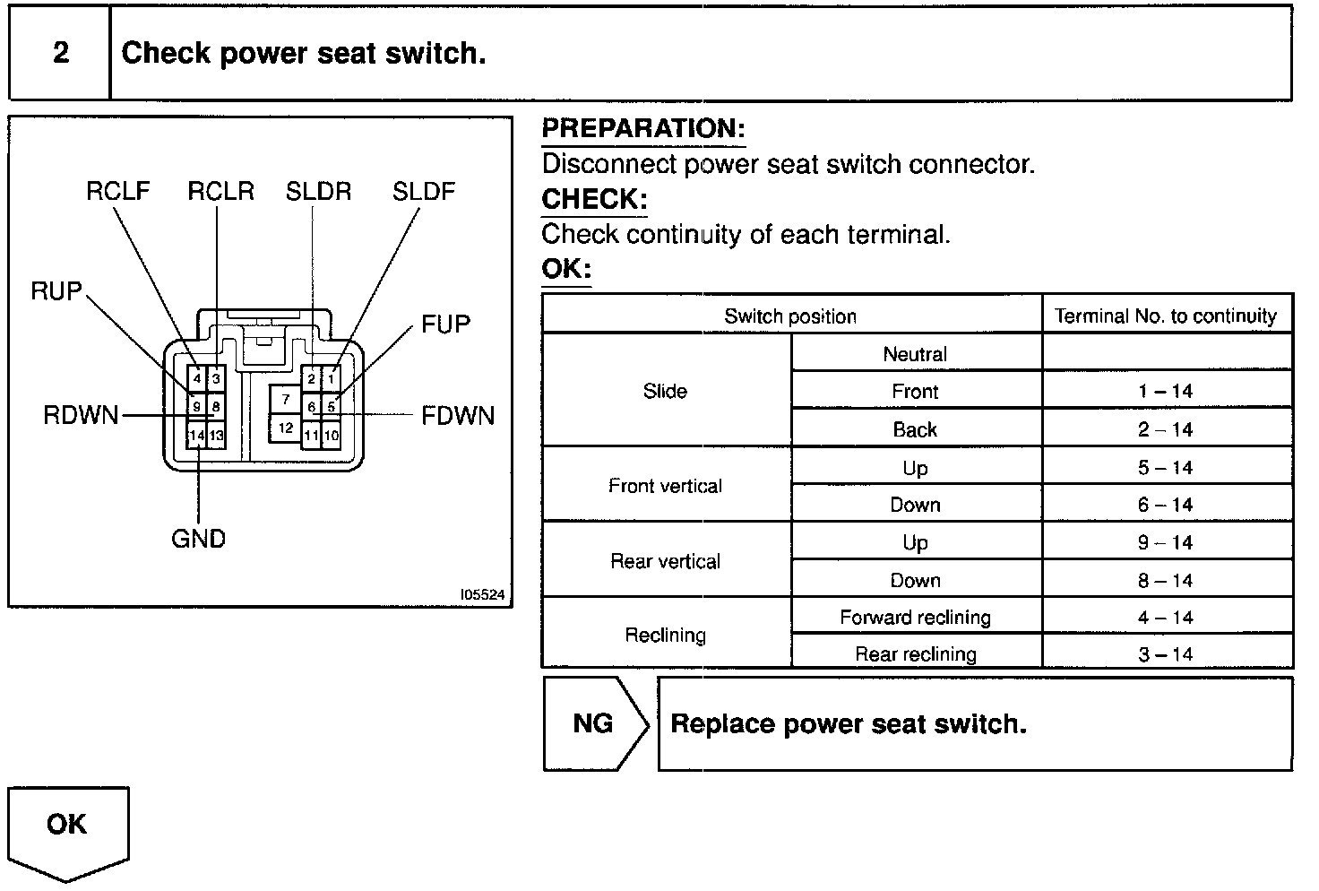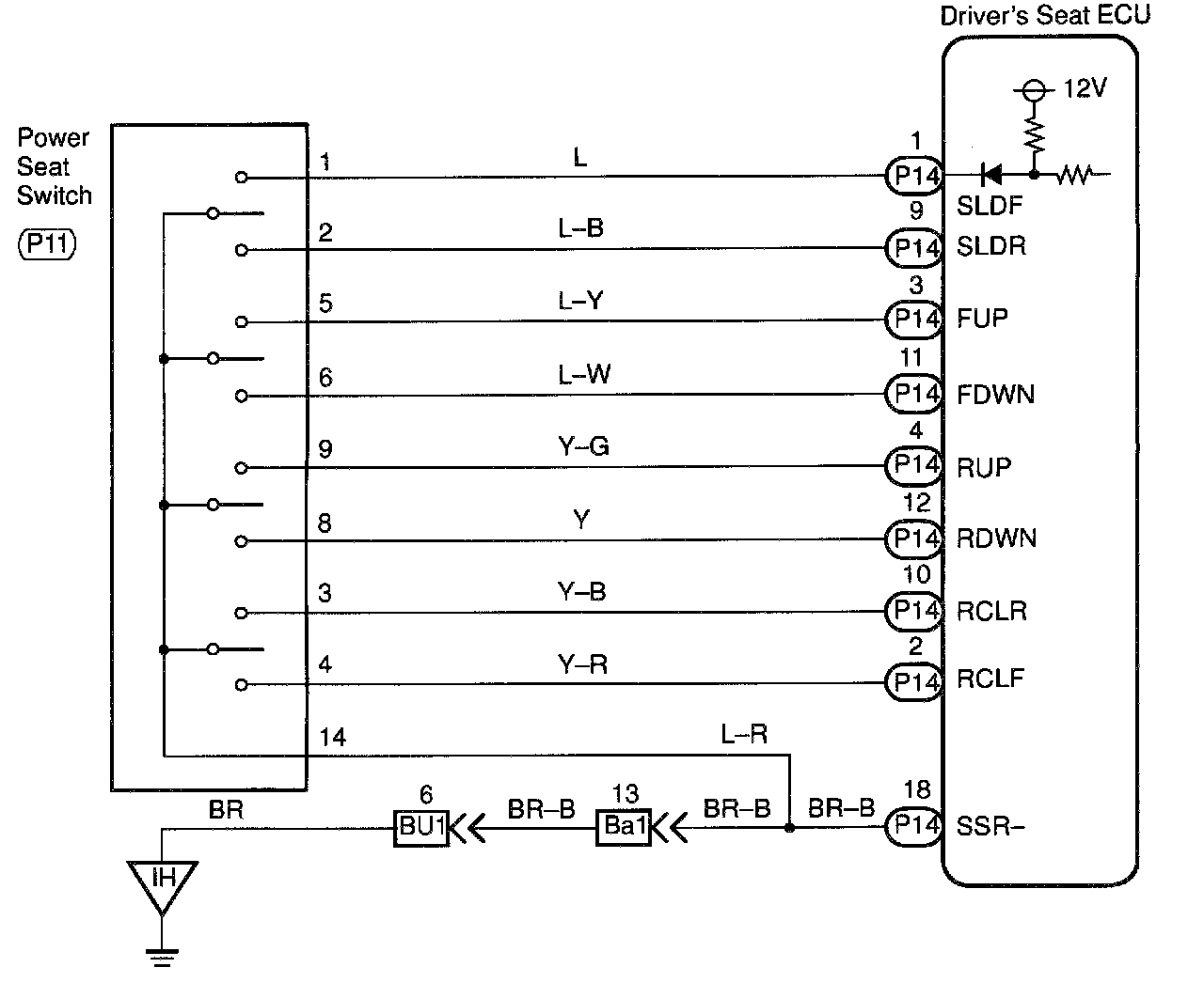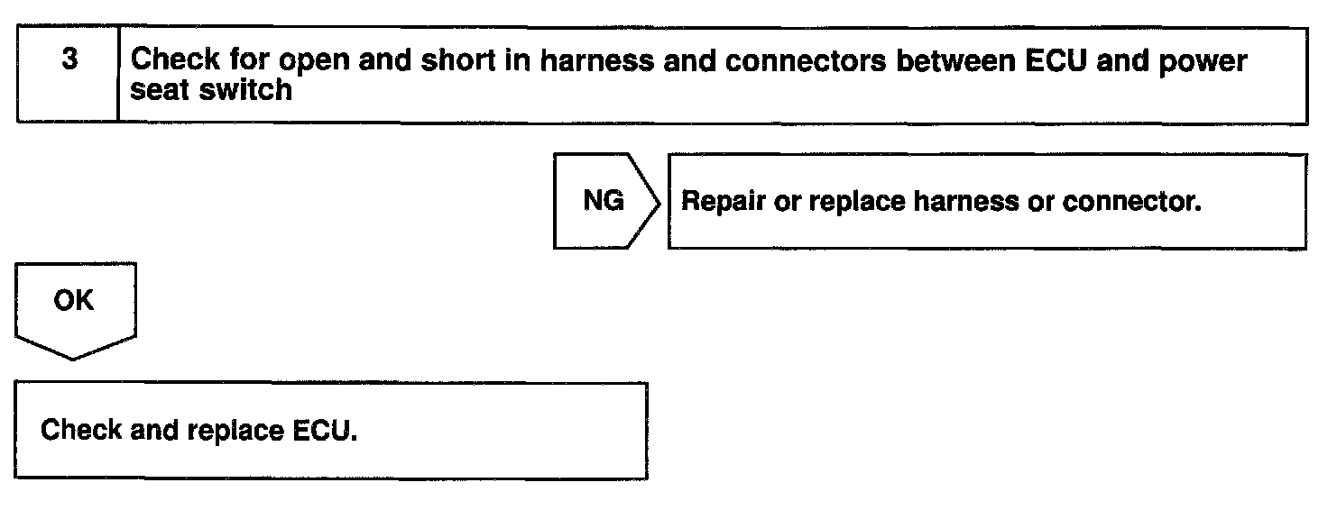 When the power seat switch is operated, a signal is sent from the power seat switch to the ECU and the ECU sends a signal to the motor to make it operate (except for the lumbar support).