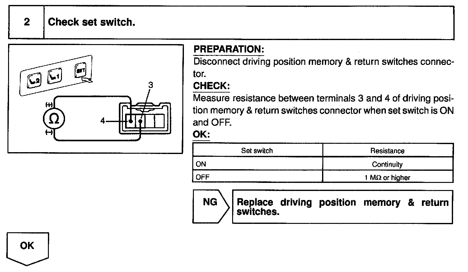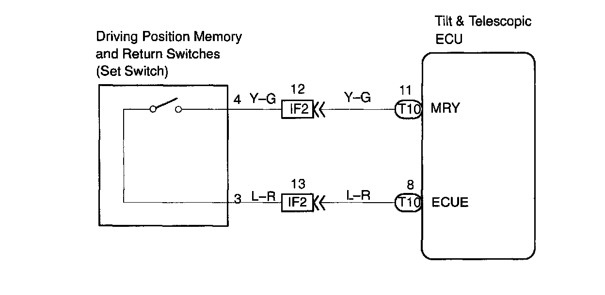 CIRCUIT DESCRIPTIONWhen switch 1 or 2 is pushed while set switch is being pushed ON in memory operation, a signal is sent to the ECU to memorize the present positions of the tilt, telescopic, seat and mirror.