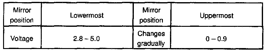 d. Apply battery positive voltage to terminals 3 and 13, then check that the voltage gradually changes according to the table while the mirror moves between the uppermost position and lowermost position.