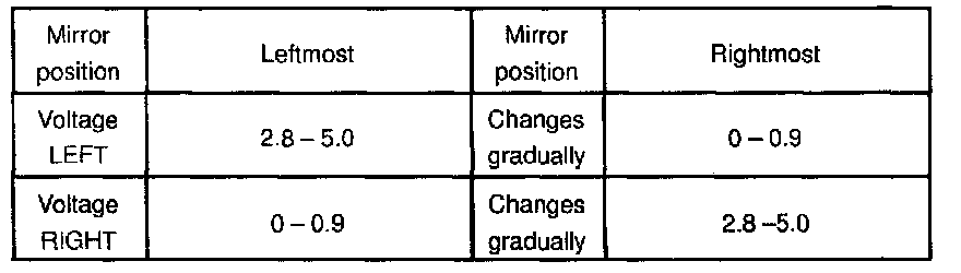 g. Apply battery positive voltage to terminals 12 and 13, then inspect that the voltage gradually changes according to the table while the mirror moves between the left most position and right most position.