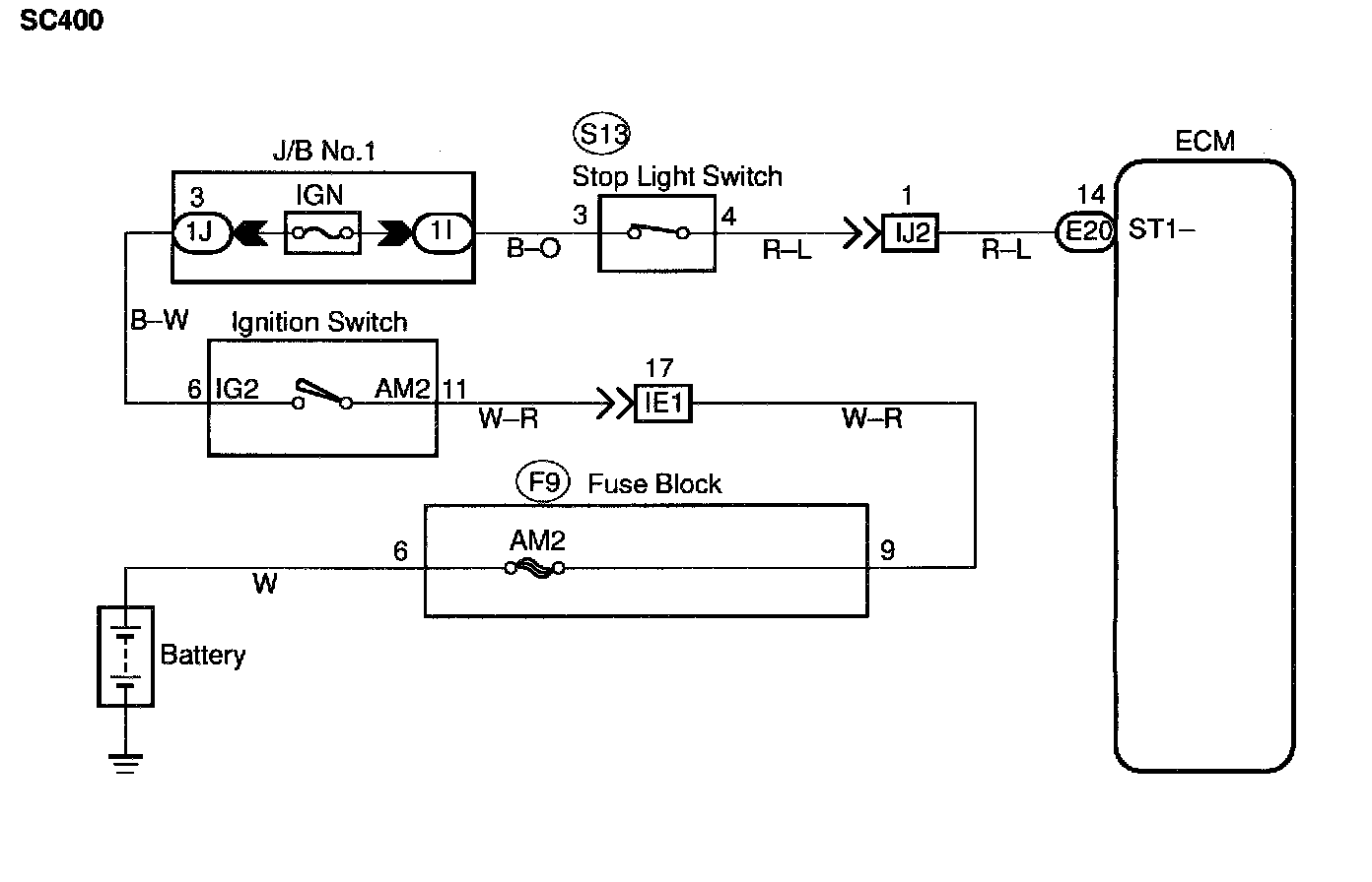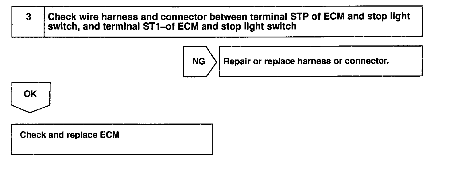 When the brake is on, battery positive voltage normally applies through the STOP fuse and stop light switch to terminal STP- of the ECM, and the ECM turns the cruise control off.