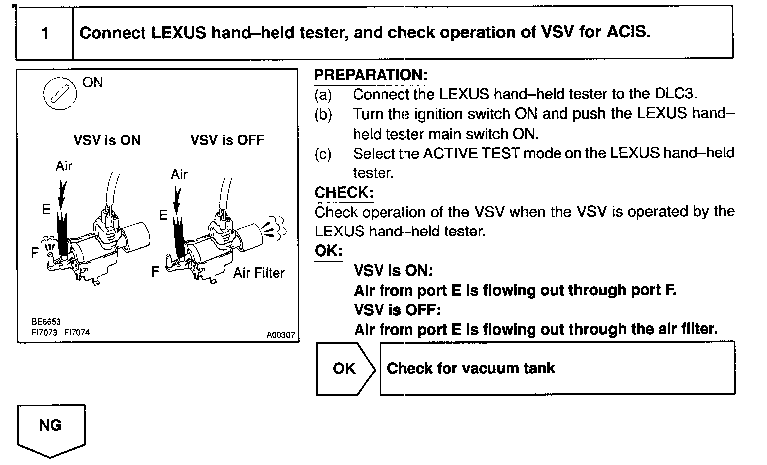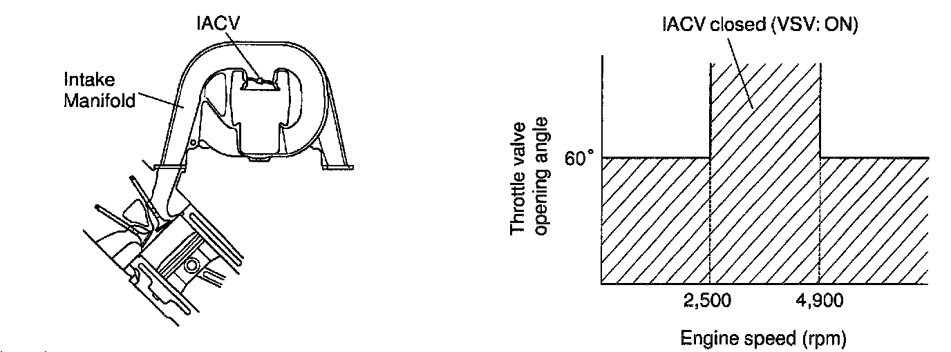 When the engine speed is 2,500 rpm or less or 4,900 rpm or more and the throttle valve opening angle is 60° or more, the VSV is OFF, so the IACV is open. All the other times, the ECM turns the VSV ON and closes the IACV.