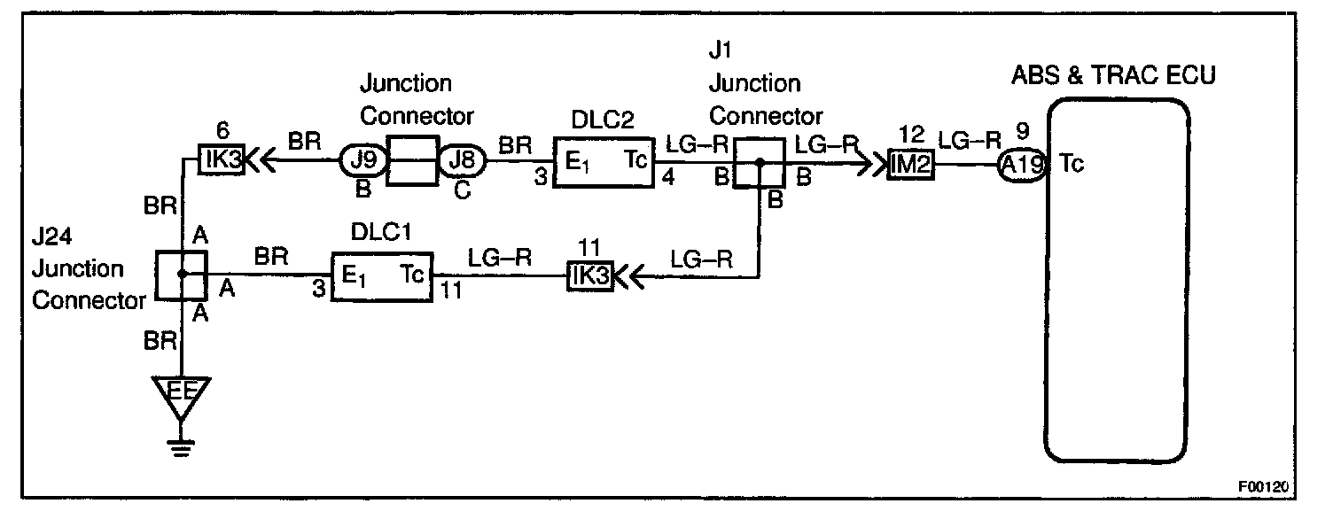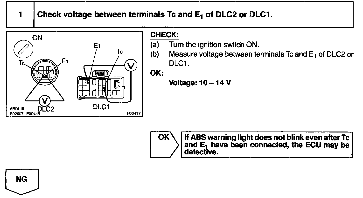Connecting between terminals Tc and E1 of the DLC1 or the DLC2 causes the ECU to display the DTC by blinking the ABS warning light and TRAC