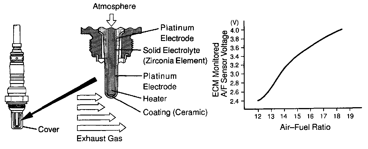 The A/F sensor is equipped with a heater which heats the zirconia element. The heater is controlled by the ECM. When the intake air volume is low (the temp. of the exhaust gas is low), current flows to the heater to heat the sensor for accurate oxygen concentration detection.