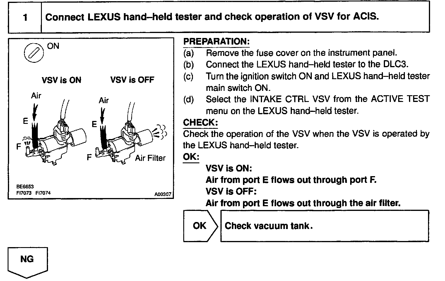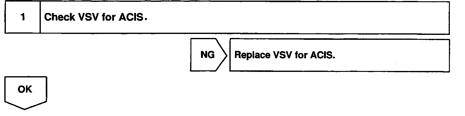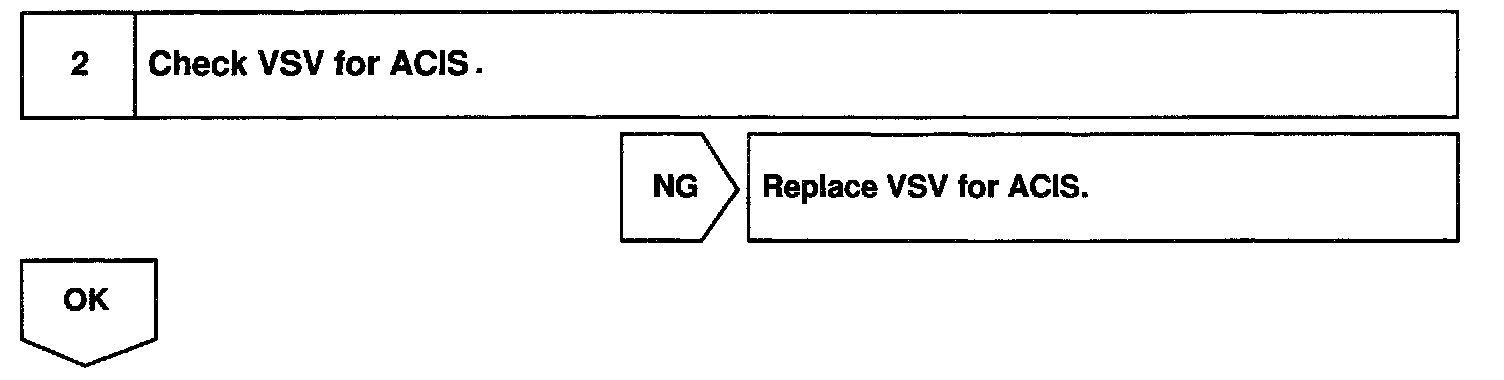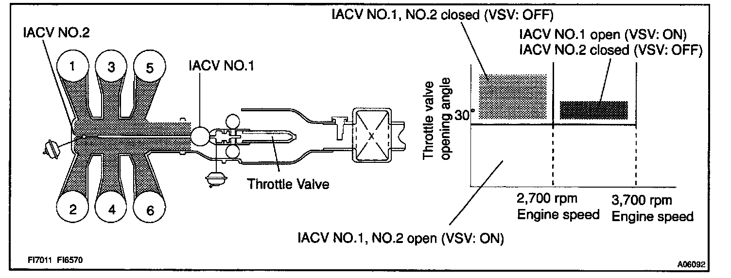 When the engine speed is 3,700 rpm or less and the throttle valve opening angle is 30° or more, the ECM turns the two VSV ON or OFF and operate the IACV.