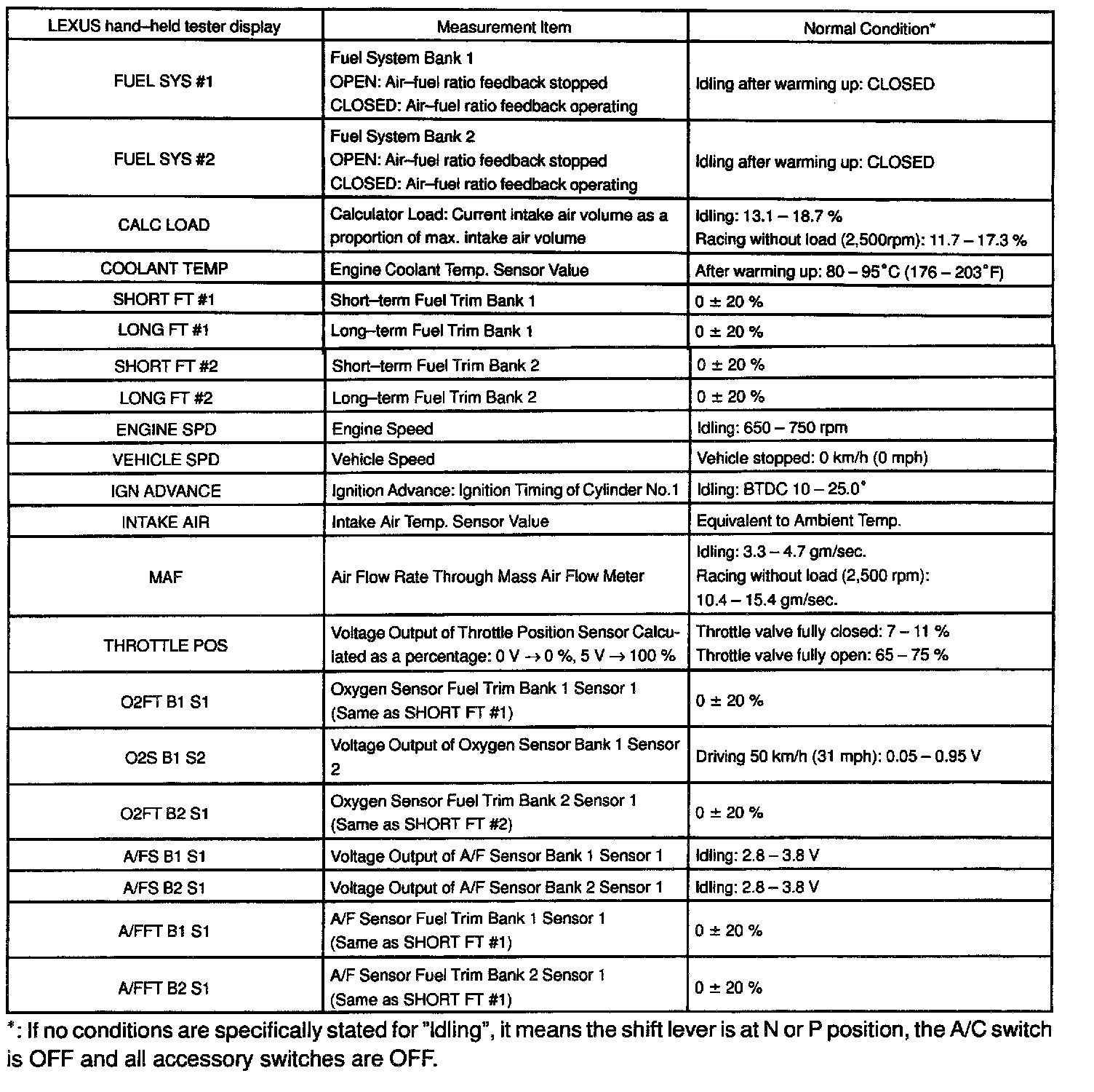 ENGINE OPERATING CONDITIONNOTE: The values given below for "Normal Condition" are representative values, so a vehicle may still be normal even if its value varies differ from those listed here. So do not decide whether a part is faulty or not solely according to the "Normal Condition" here.