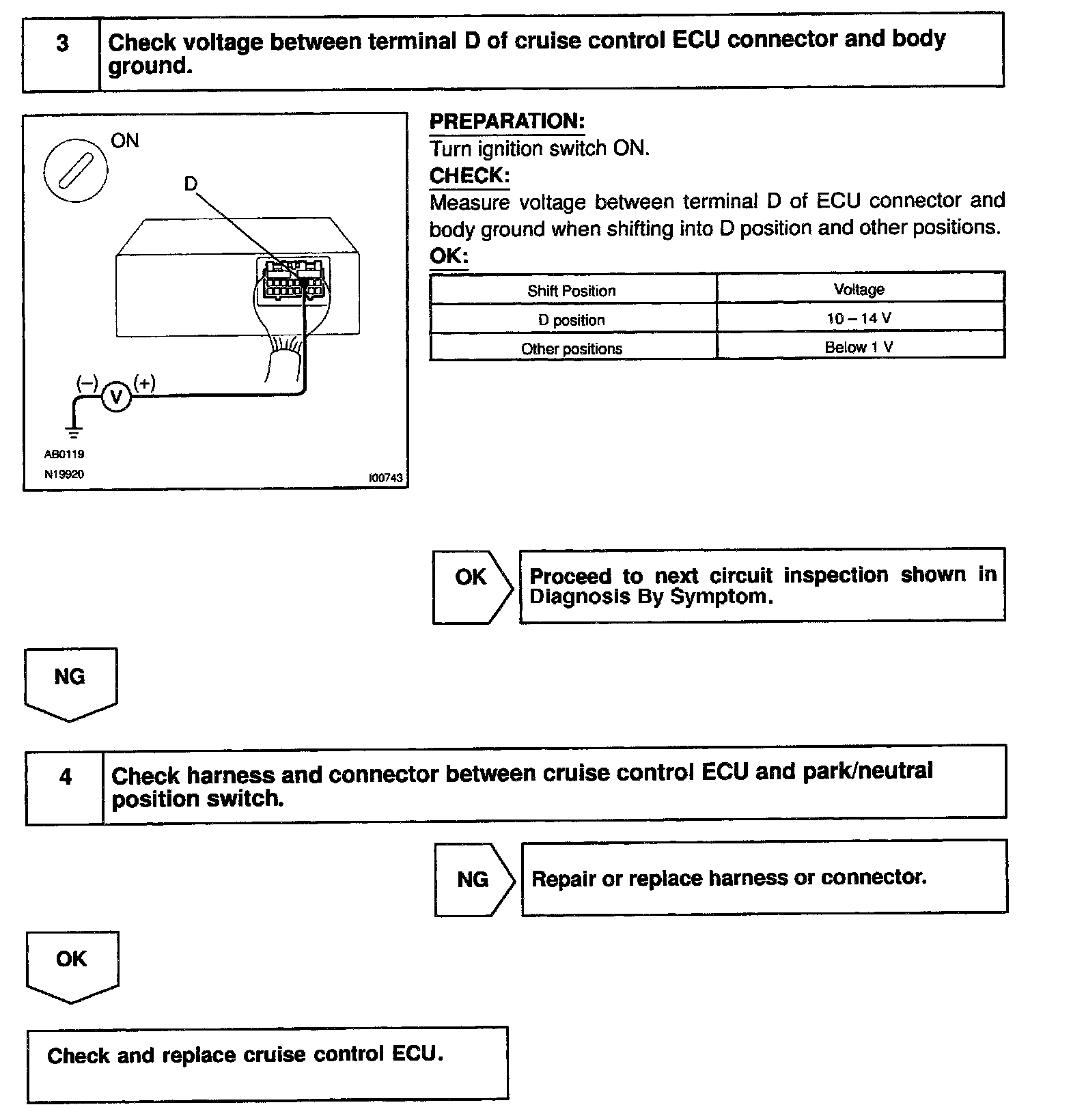 CIRCUIT DESCRIPTIONWhen the shift position is put in except D position, a signal is sent from the park/neutral position switch to the ECU. When this signal is input during cruise control driving, the ECU cancels the cruise control-