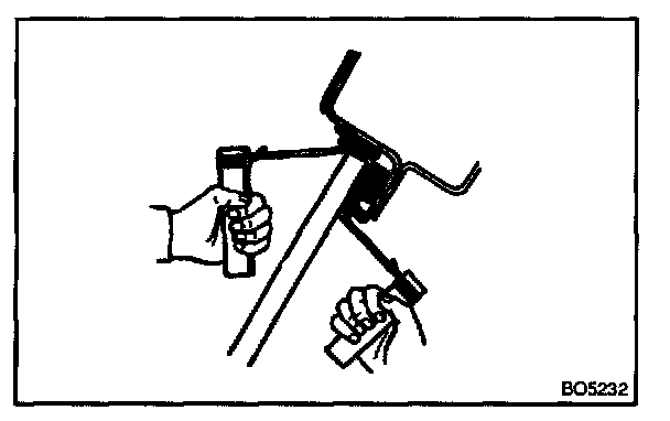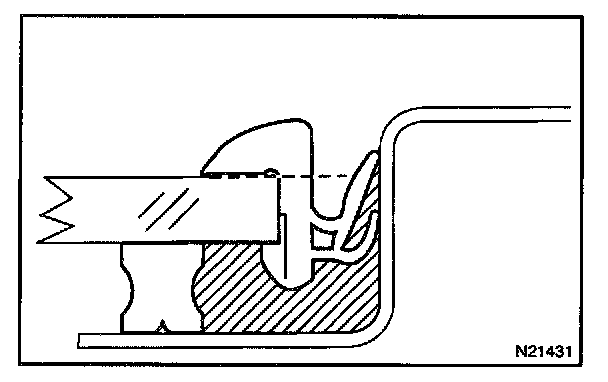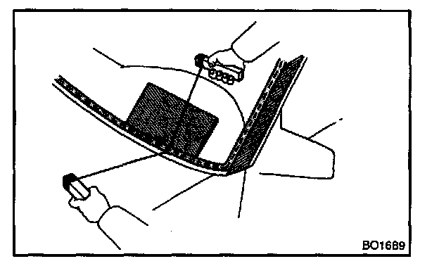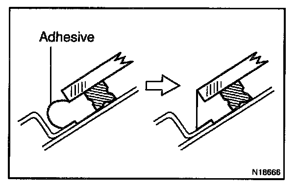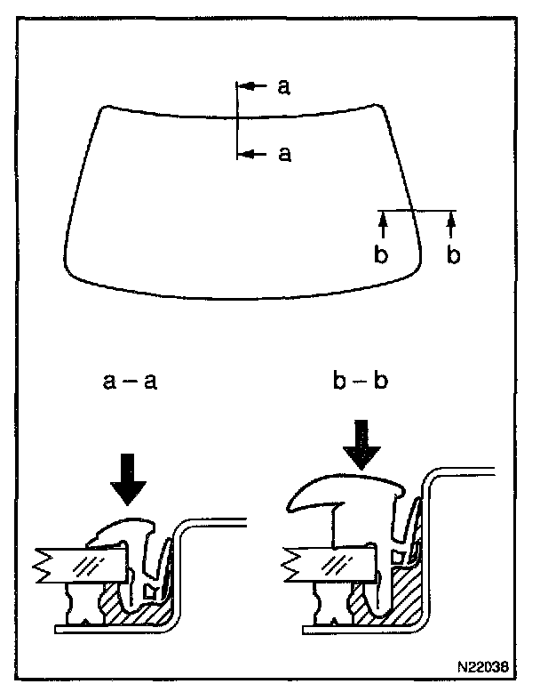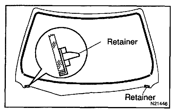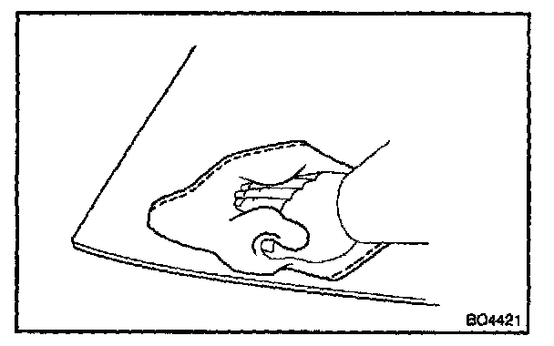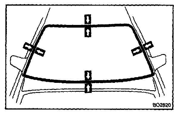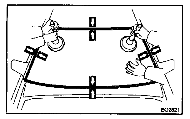 NOTE: When separating the glass, take care not to damage the paint and interior and exterior ornaments. To prevent scratching the safety pad when removing the windshield, place a plastic sheet between the piano wire and safety pad.