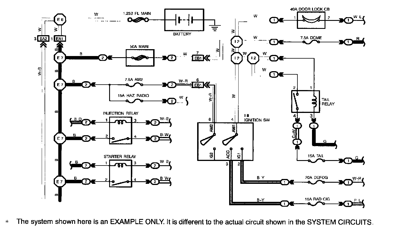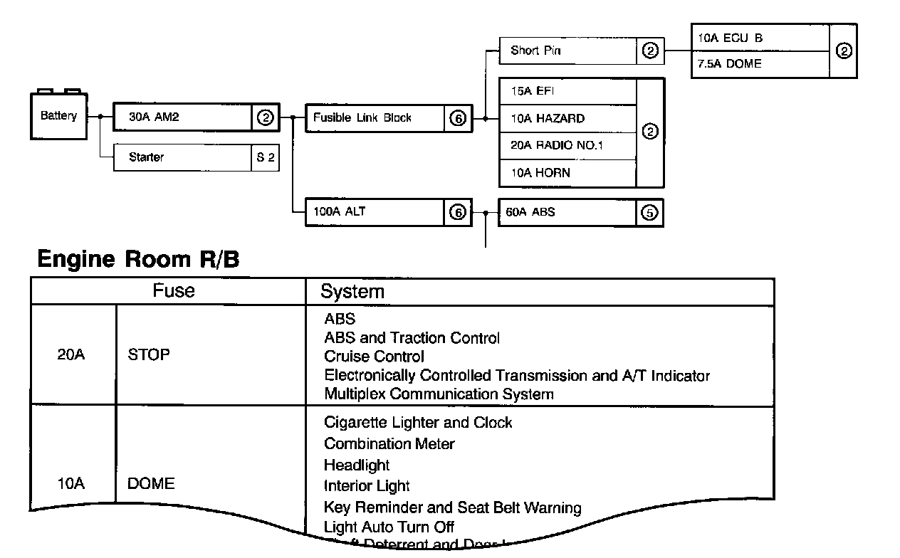 The chart below shows the route by which current flows from the battery to each electrical source (Fusible Link, Circuit Breaker, Fuse, etc.) and other parts.
