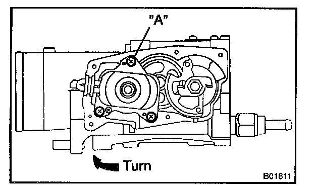 3. Rotate the motor to the direction marked with an arrow and temporarily install the set screw "A" under the condition that there is no wobbles in the motor and the positioning pin.