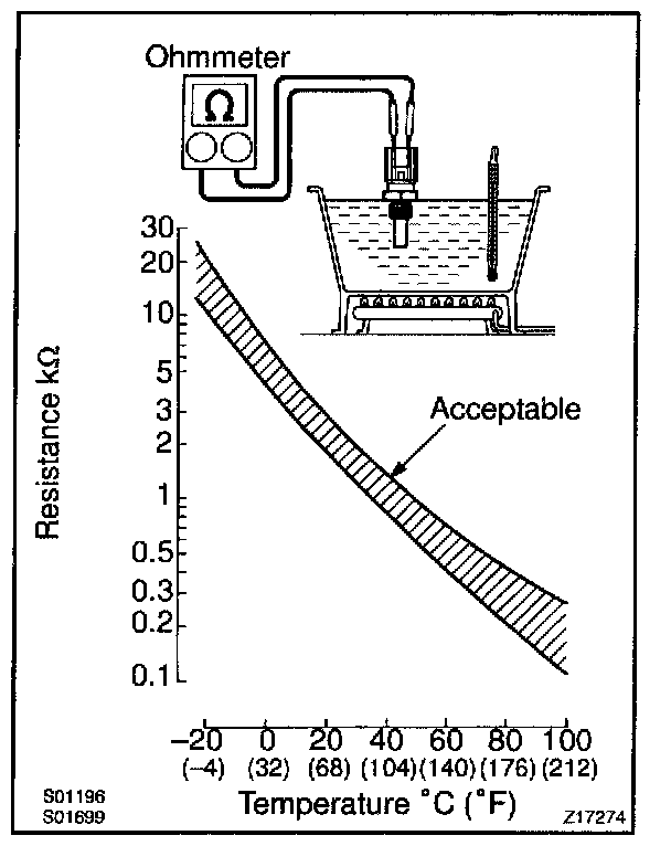 b. Using an ohmmeter, check that continuity exists between the terminals when the coolant temperature is below 91 °C(196 °F).
