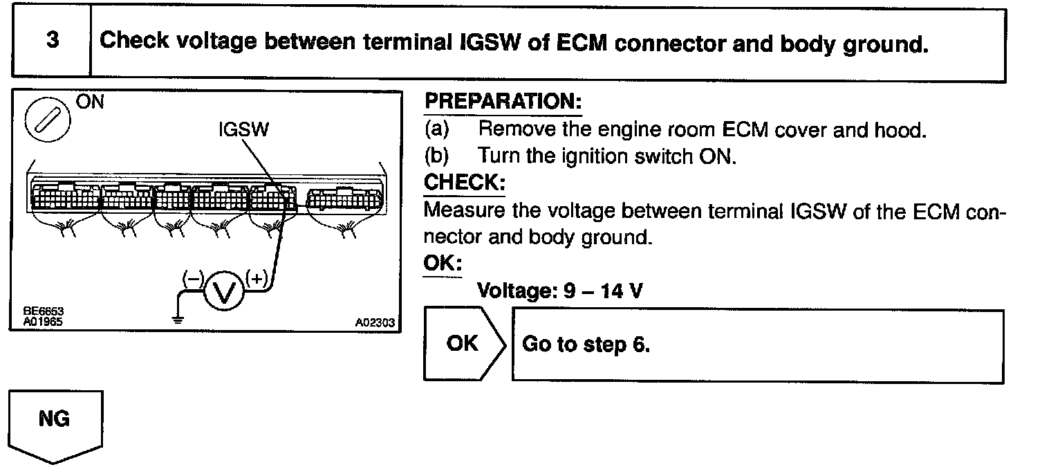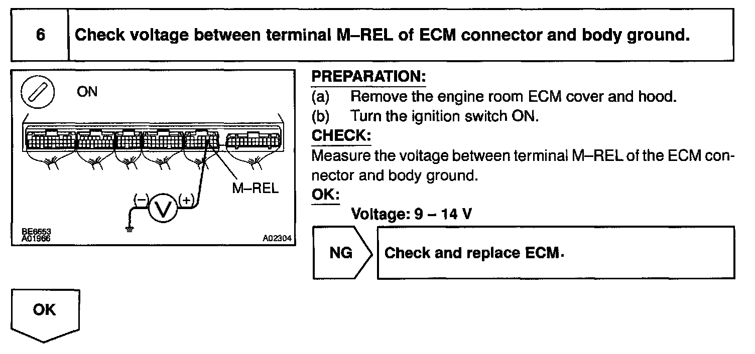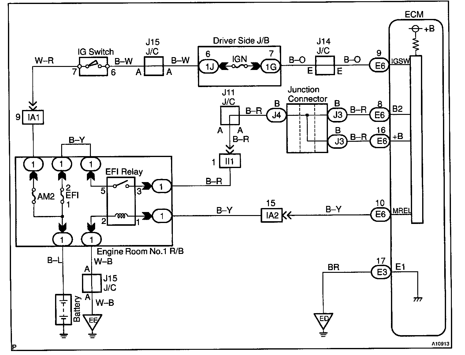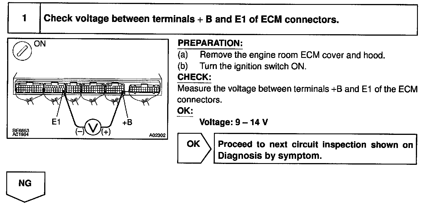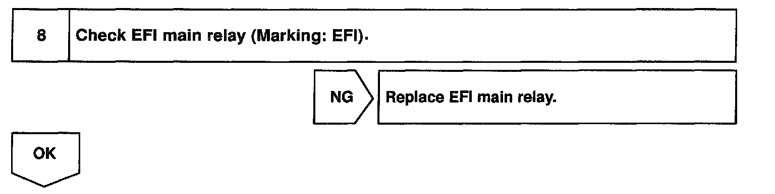 This signal causes current to flow to the coil, closing the contacts of the EFI main relay and supplying power to terminals +B and B2 of the ECM.