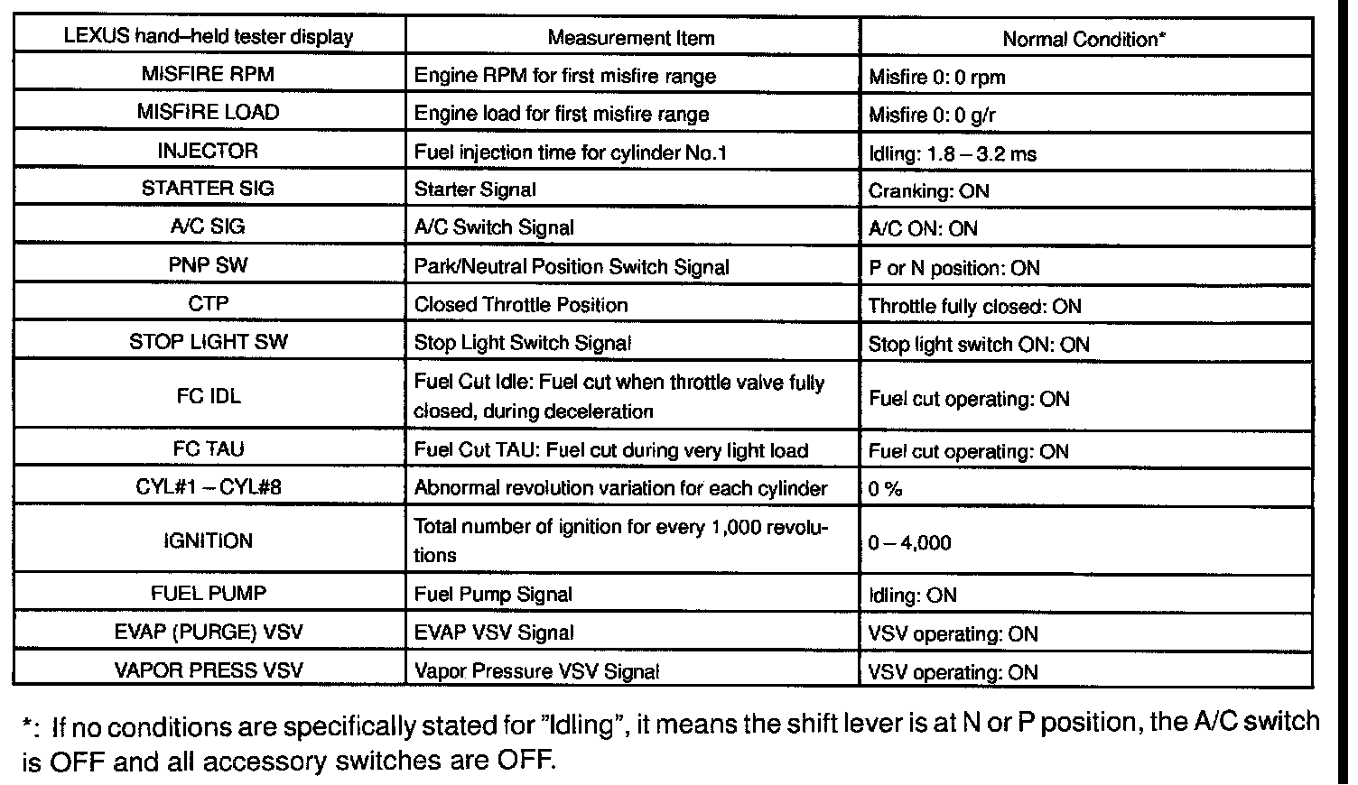 ENGINE OPERATING CONDITIONNOTE: The values given for "Normal Condition" are representative values, so a vehicle may still be normal even if its value varies differ from those listed here. So do not decide whether a part is faulty or not solely according to the "Normal Condition" here.