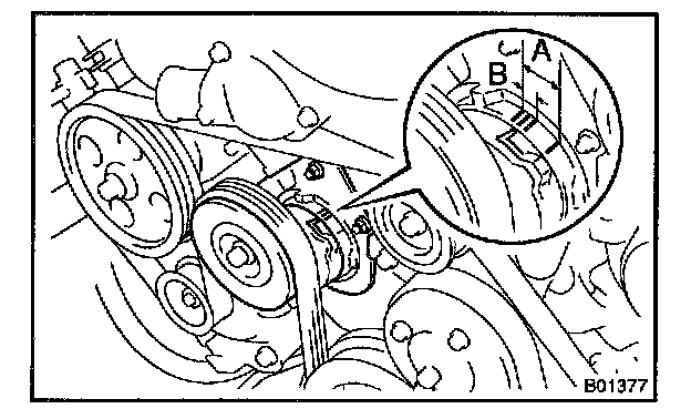 3. Check that the arrow mark on the belt tensioner falls within area A of the scale.