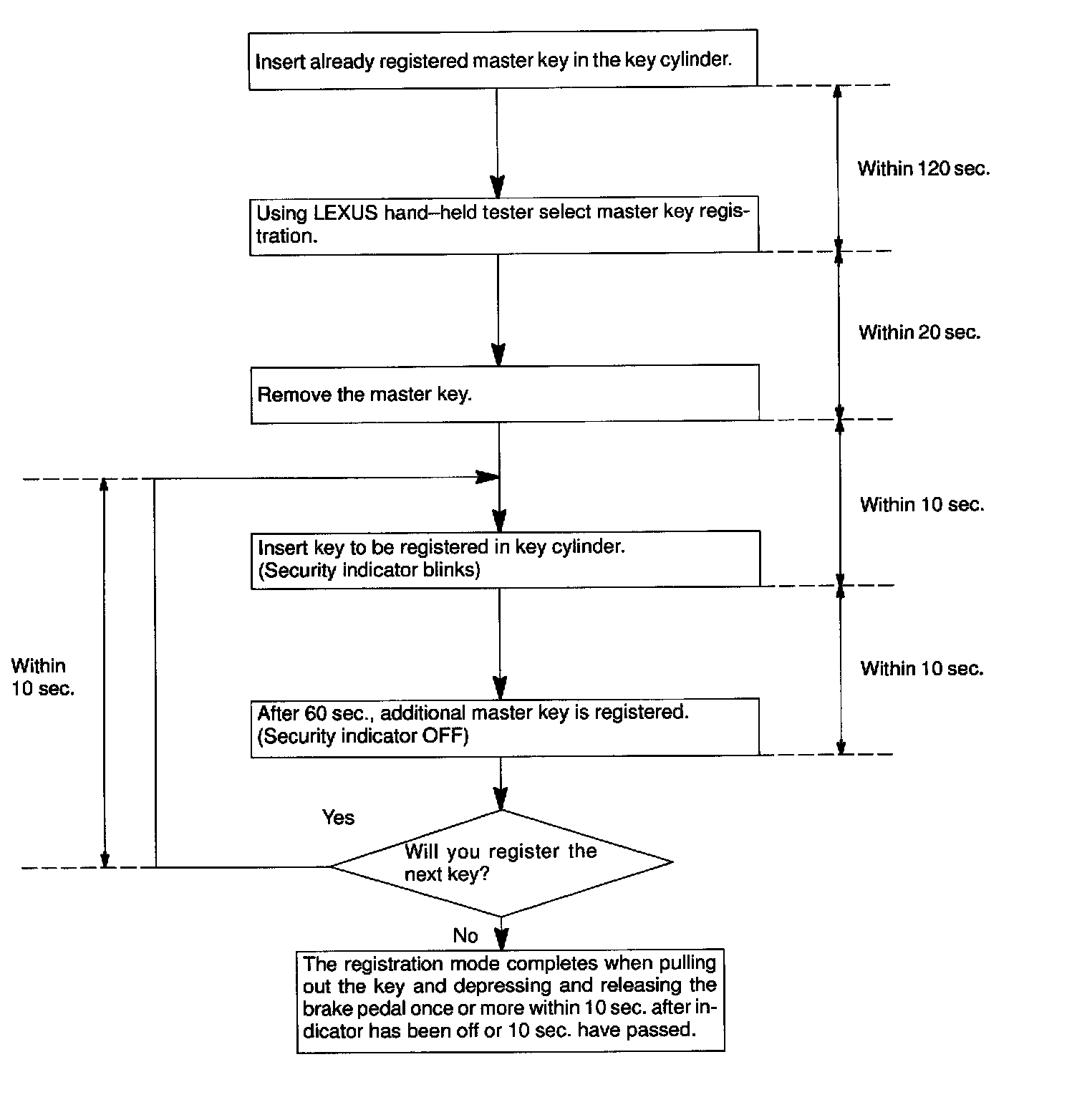There are 2 ways for registration of additional master key, one way is depressing brake pedal and acceleration pedal and the other way is using LEXUS hand-held tester.