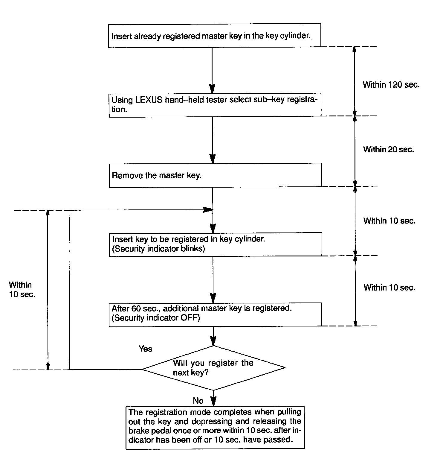 There are 2 ways for registration of additional sub-key, one way is depressing brake pedal and acceleration pedal and the other way is using LEXUS hand-held tester.