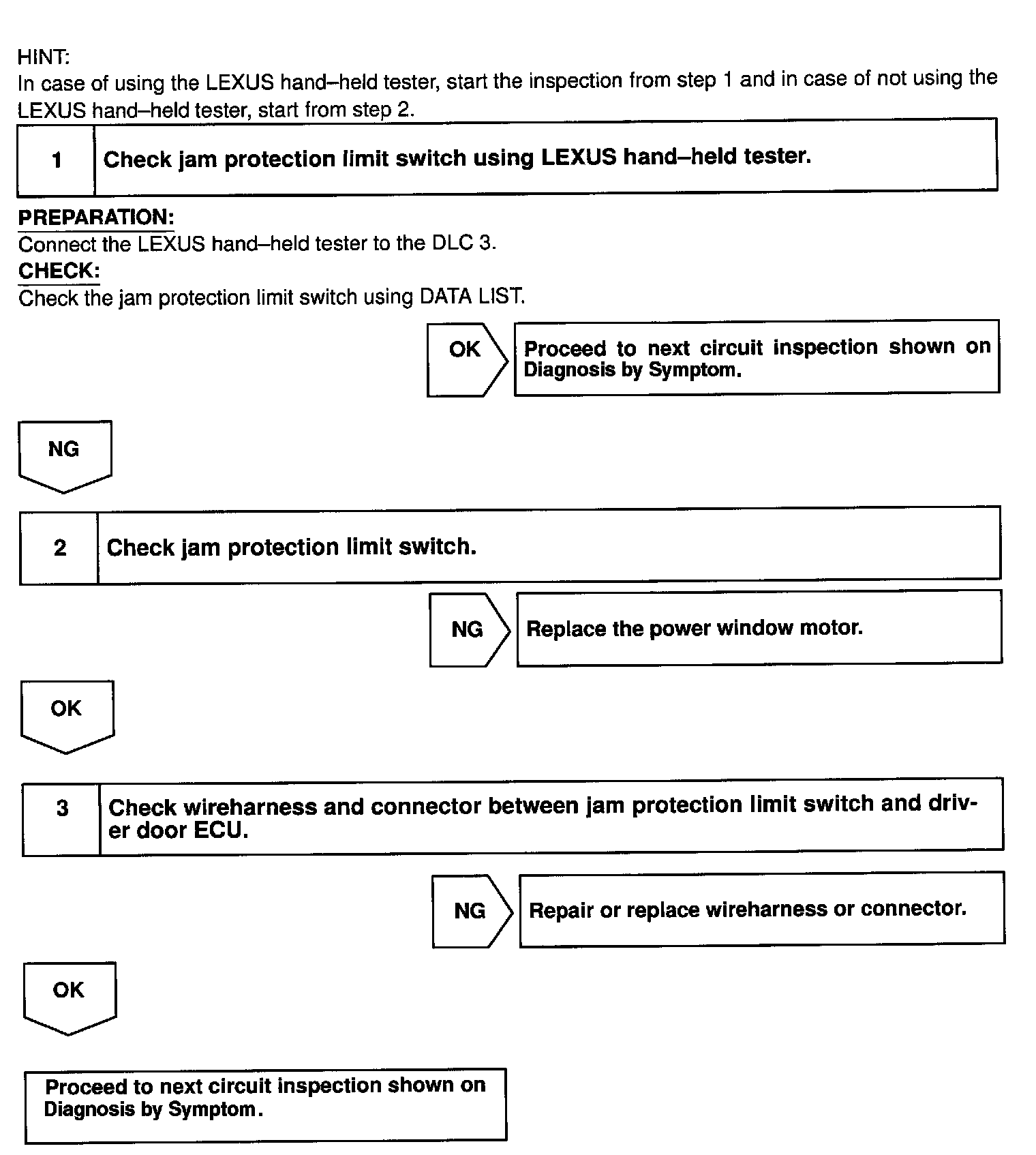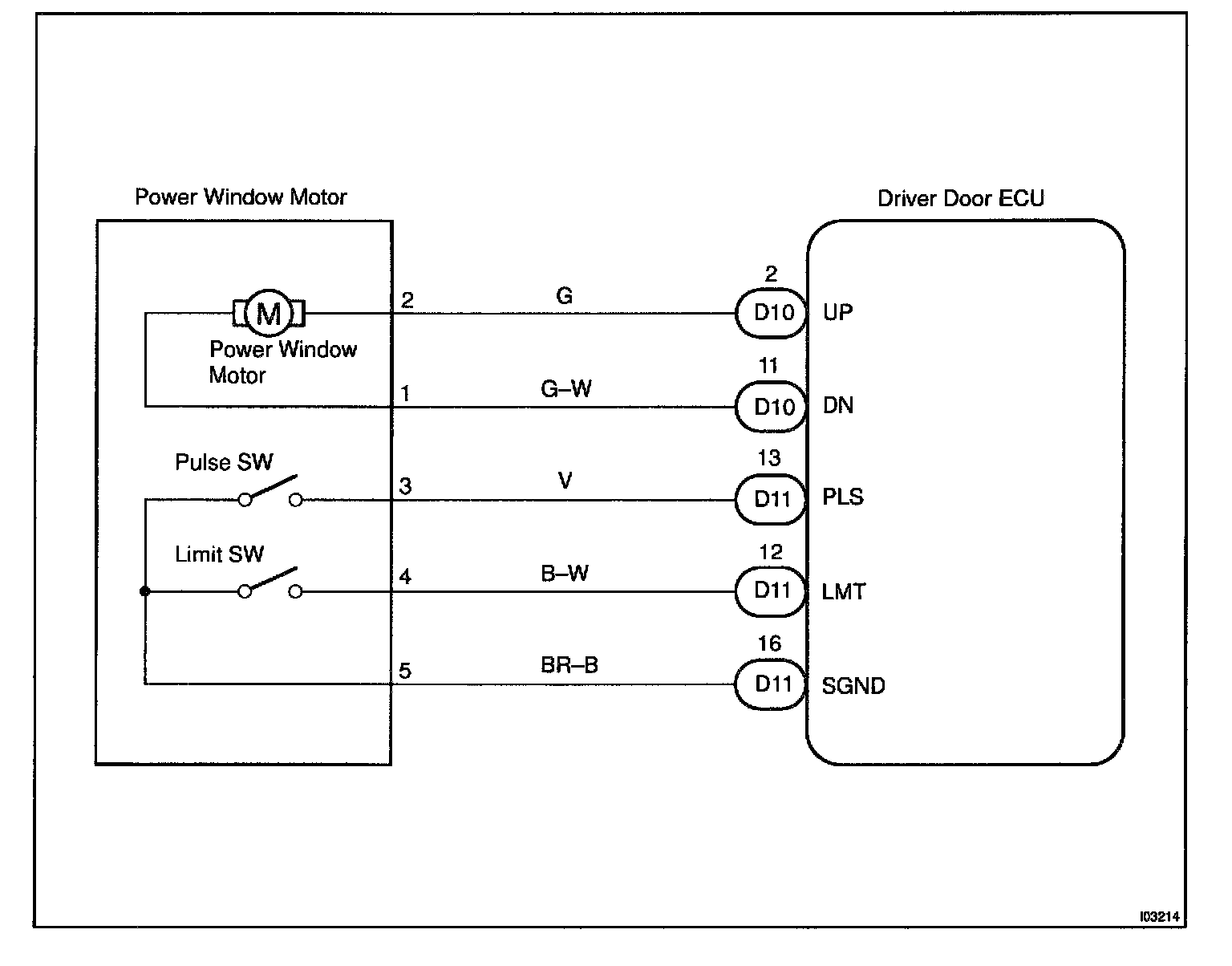 CIRCUIT DESCRIPTIONJam protection limit switch is built-in the power window motor. This switch functions to turn "OFF" before the top dead center, and ECU reads this "OFF" signal resulting in closing the window fully.