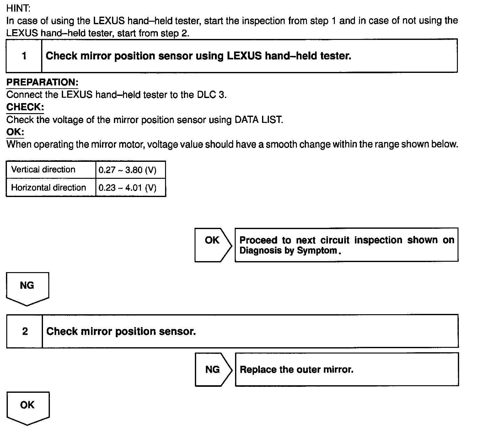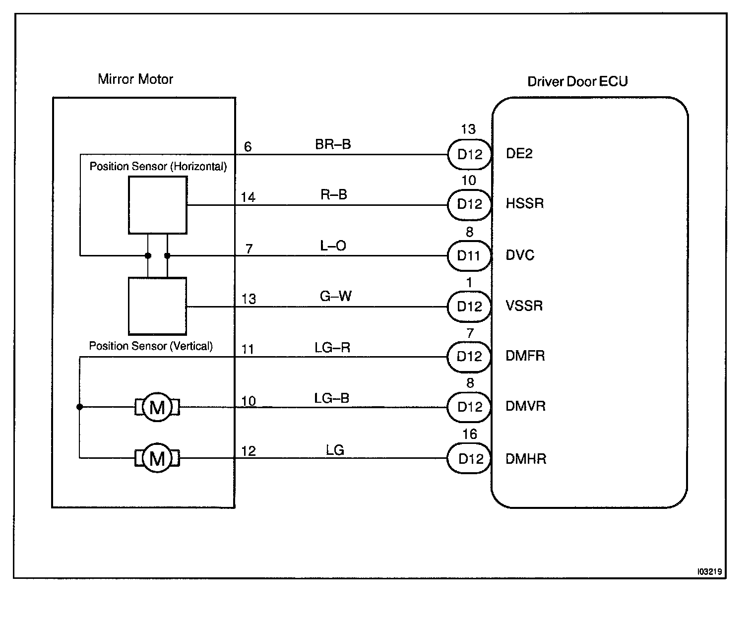 CIRCUIT DESCRIPTIONThis position detected by the mirror position detection sensor will be memorized in the seat ECU. This sensor is equipped in the mirror in spite of the existence of the memory function.