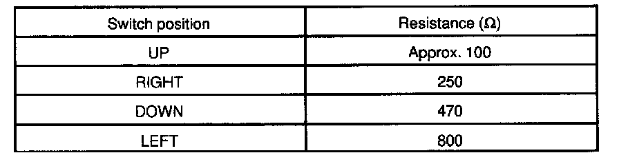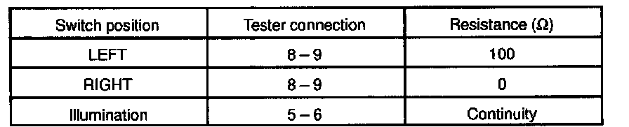 Measure resistance between terminals 7 and 9 at each switch position, as shown in the chart.