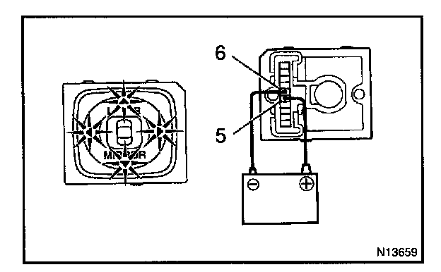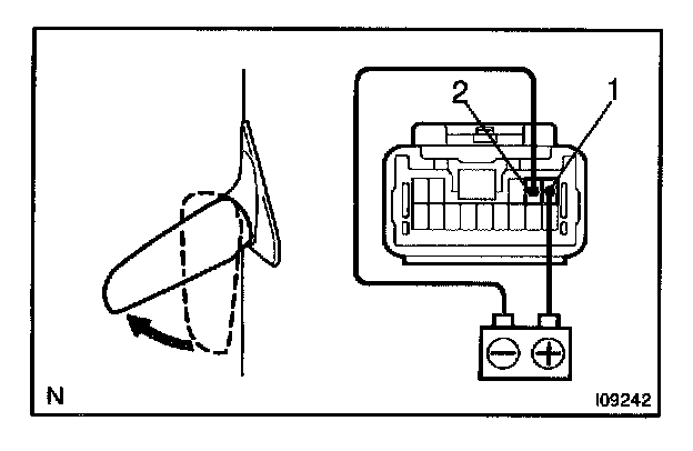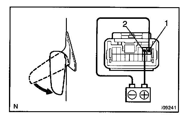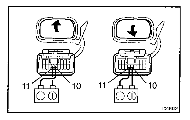 c. Connect the positive (+) lead from the battery to terminal 11 and negative (-) lead to terminal 10, then check that the mirror turns upward.