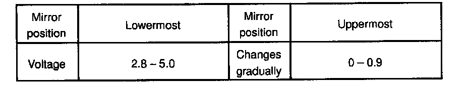 d. Apply battery positive voltage to terminals 10 and 11, then check that the voltage gradually changes according to the table below while the mirror moves between the uppermost position and lowermost position.