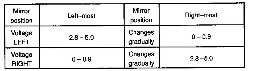 g. Apply battery positive voltage to terminals 11 and 12, then inspect that the voltage gradually changes according to the table below while the mirror moves between the left- most position and right-most position.