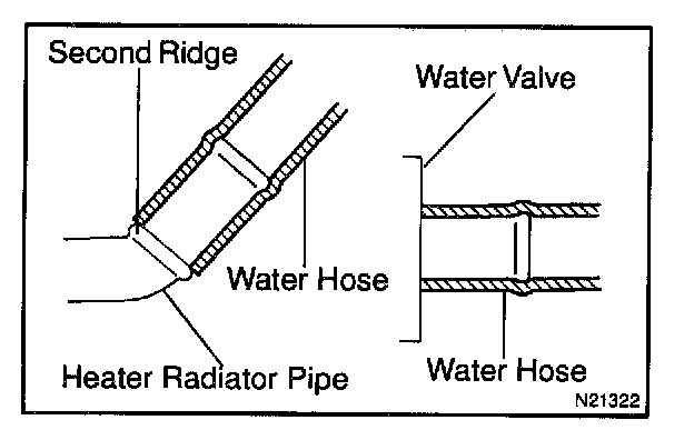 - Push the water hose onto the heater radiator pipe as far as the second ridge on the pipe.