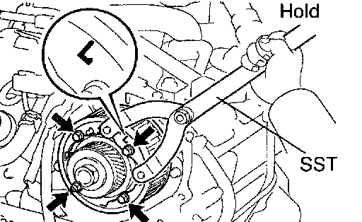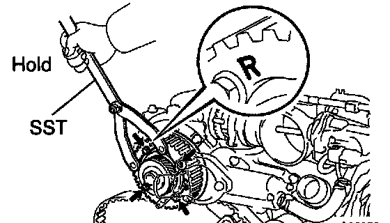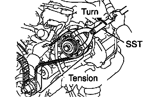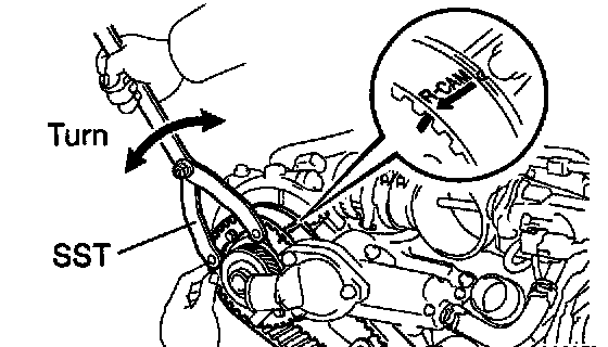 c. Using SST, turn the LH camshaft timing pulley counterclockwise until there is tension between the crankshaft timing pulley and LH camshaft timing pulley.
