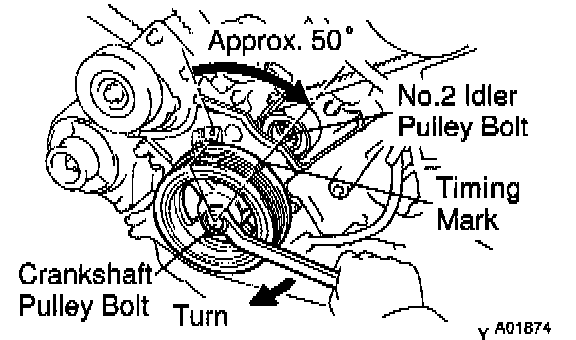 c. Turn the crankshaft pulley approx. 50° clockwise, and put the timing mark of the crankshaft pulley in line with the centers of the crankshaft pulley bolt and the idler pulley bolt.