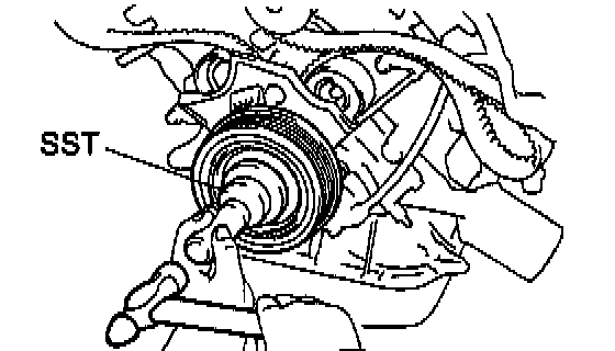 b. Using SST and a hammer, tap in the crankshaft pulley.