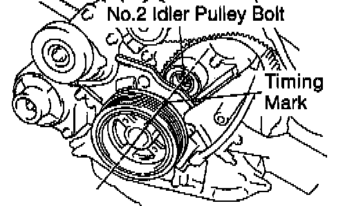 Check that the timing mark of the crankshaft pulley is aligned with the centers of the crankshaft pulley and the idler pulley bolt.