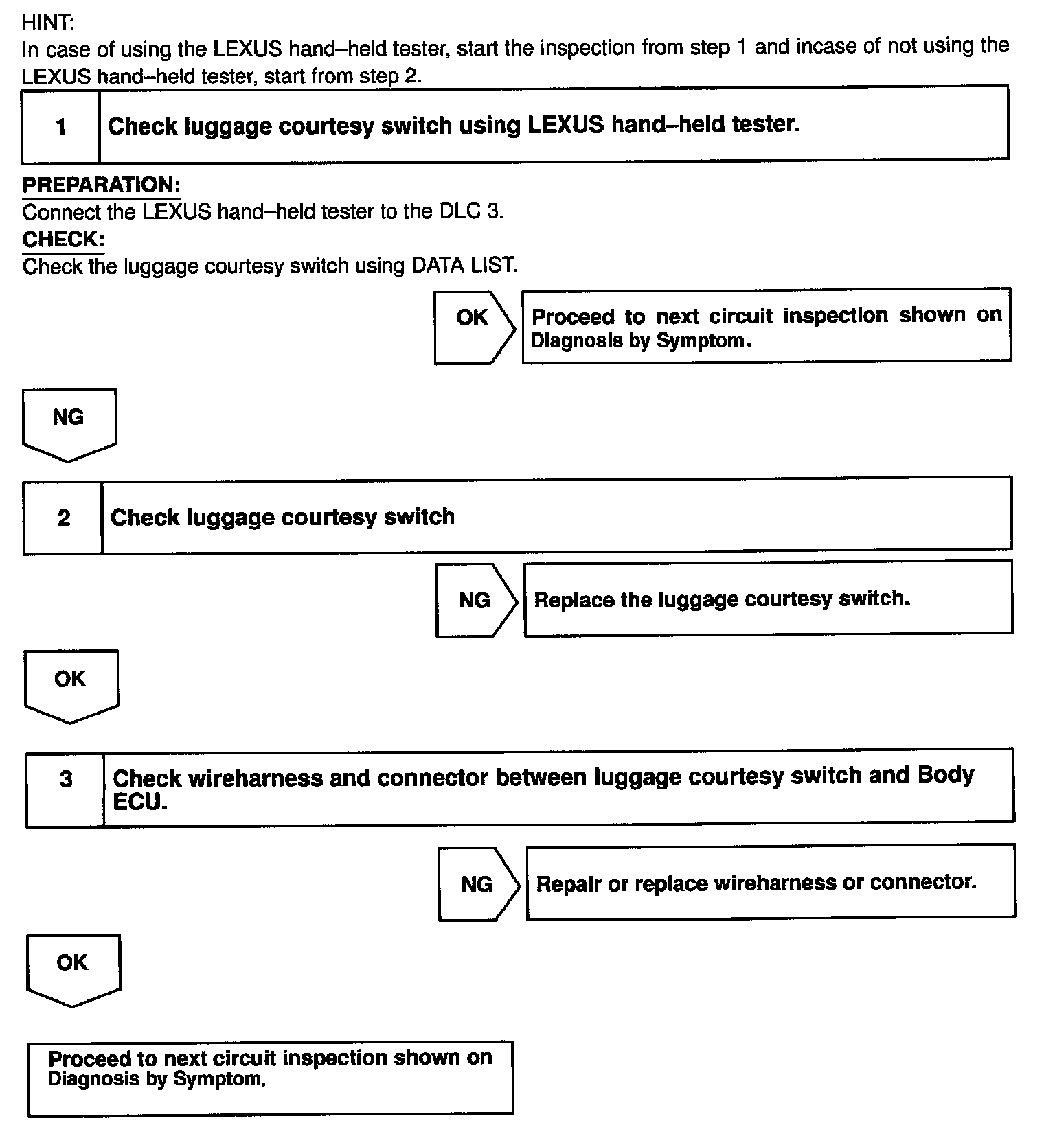 The luggage courtesy switch goes on when luggage compartment door is opened and goes off when luggage compartment door is closed.