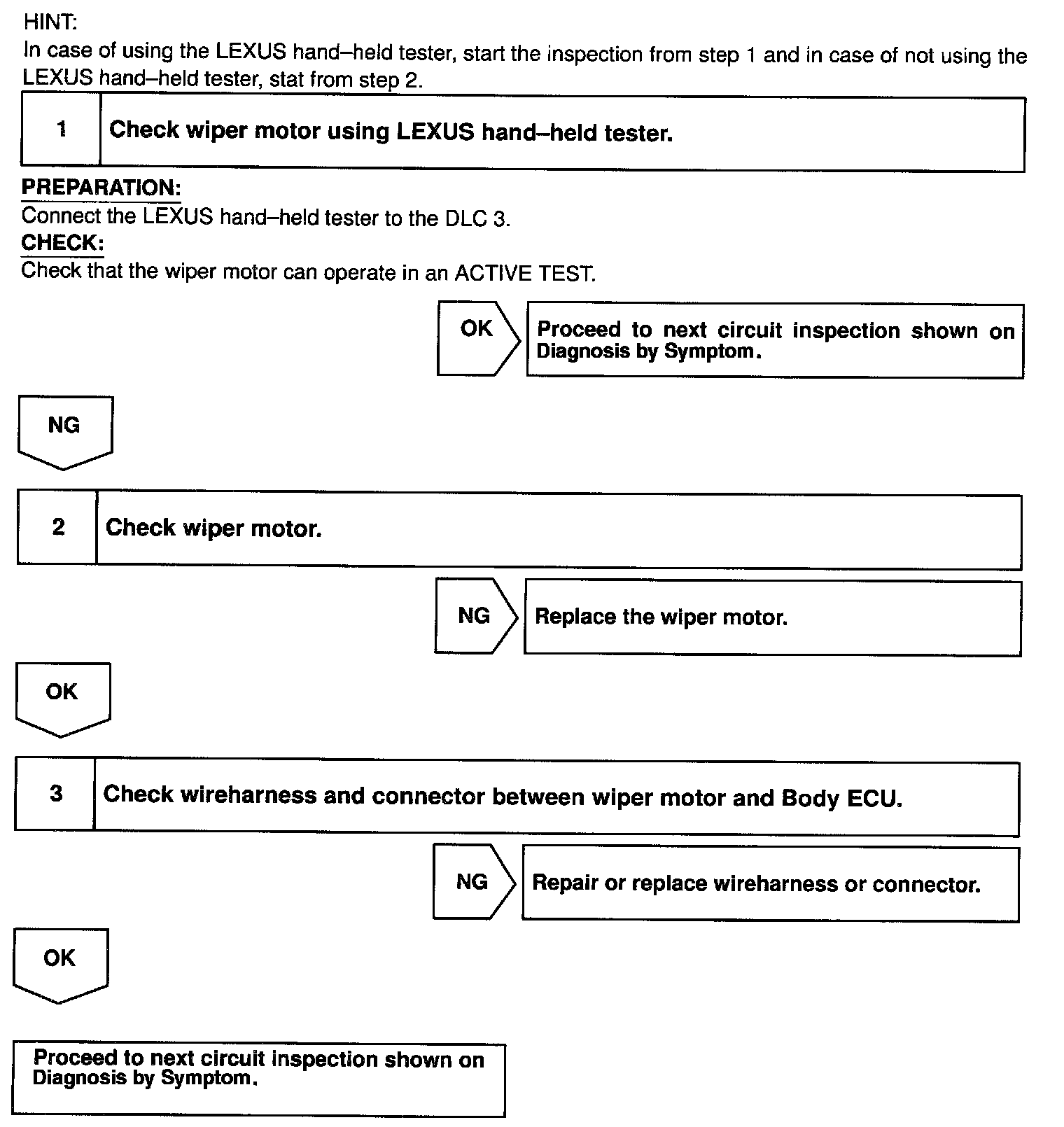 Wiper motor is controlled by the Body ECU. Even CPU is in the failure, its circuit structure enables to operate the wiper with "High" mode.