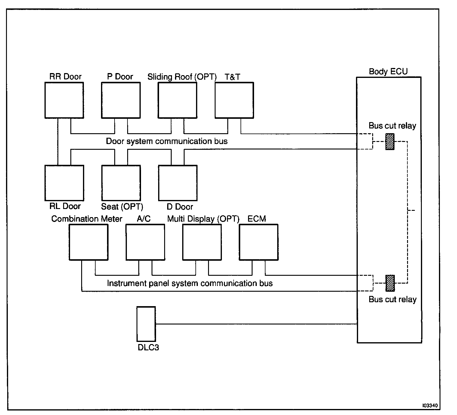 A. As shown in the following illustration, each ECU of this vehicle is connected by communication bus and it transmits each signal by communication. This communication bus is self-diagnosed by Body ECU and it memorizes DTC when it detects communication stop to ECU or communication bus +B short or GND short. There is a possibility that Body ECU cannot self-diagnose accurately unless it doesn't work normal. So, please note that the troubleshooting of Body Electrical System should be done after confirming if Body ECU and Open door indicator works normal by "BASIC INSPECTION".Component Tests and General Diagnostics