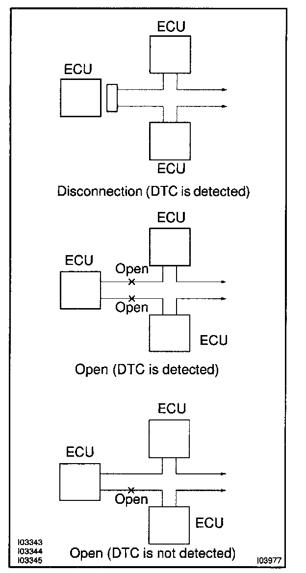 B. If DTC of ECU communication stop is output, there is a possibility of connector disconnection or 2 communication buses open. It will not become abnormal with only 1 communication bus open.
