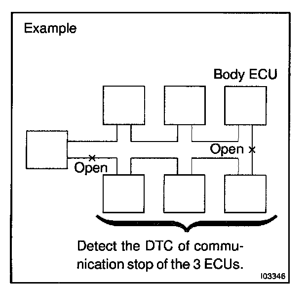 C. If 2 communication buses are open at the position as shown in the illustration, DTC of ECU communication stop between those 2 buses is output.