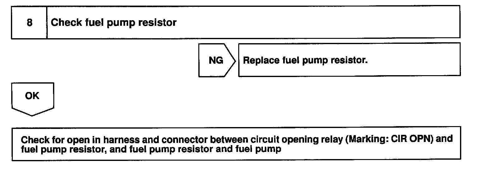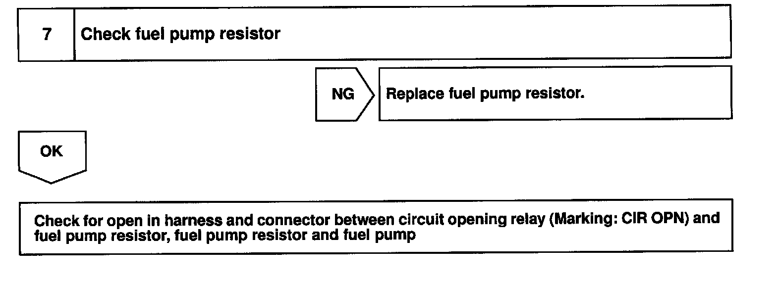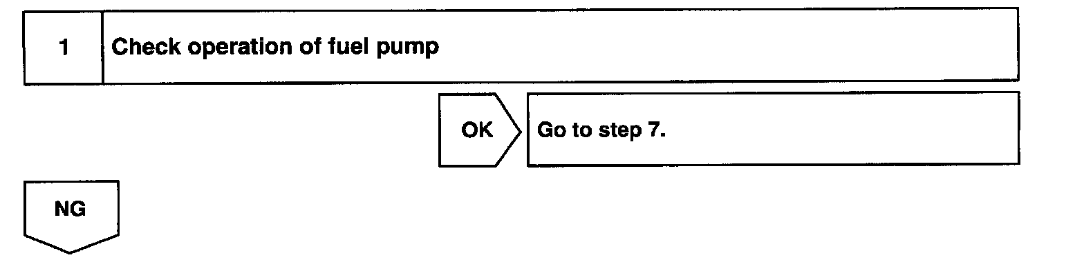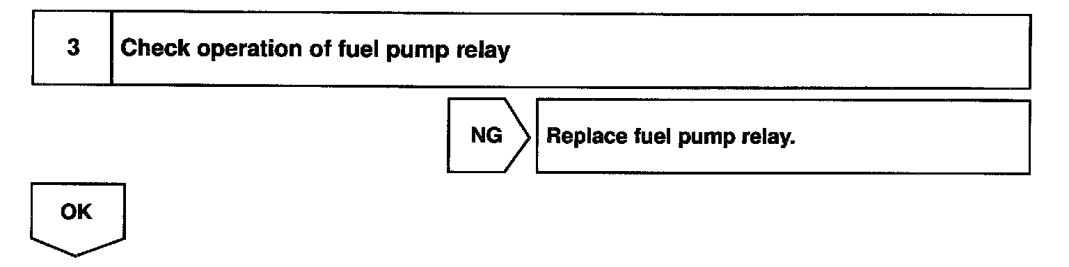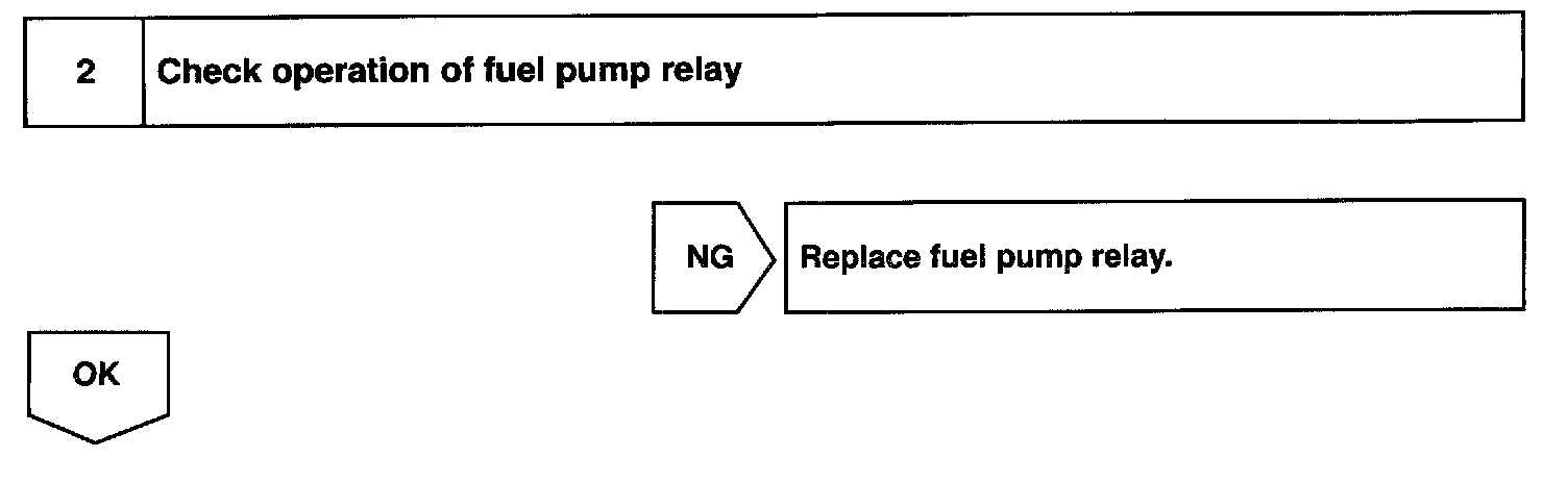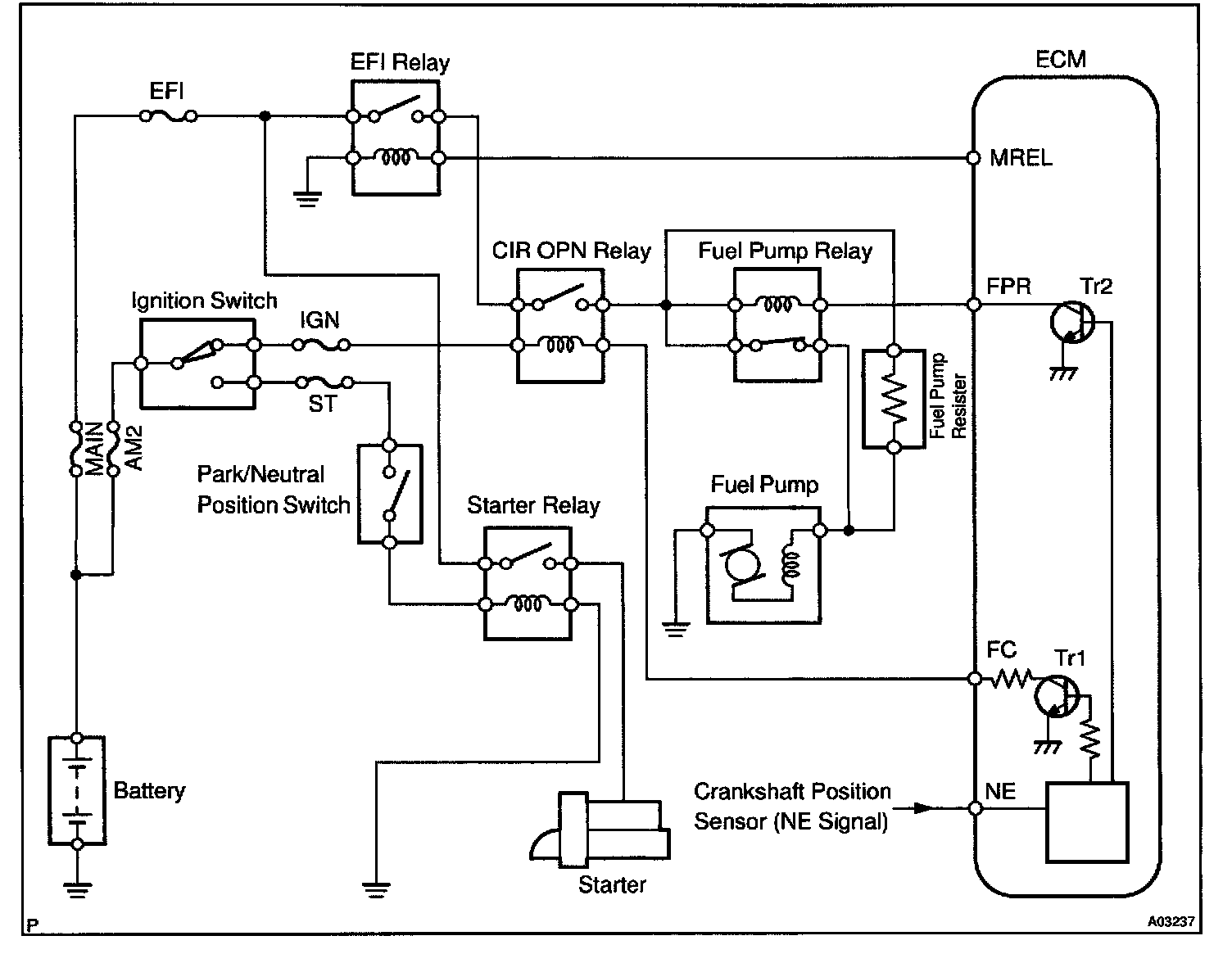 When the STA signal and NE signal are input to the ECM, Tr1 is turned ON, current flows to coil of the circuit opening relay, the relay switches on, power is supplied to the fuel pump and the fuel pump operates. While the NE signal is generated (engine running), the ECM keeps Tr1 ON (circuit opening relay ON) and the fuel pump also keeps operating.