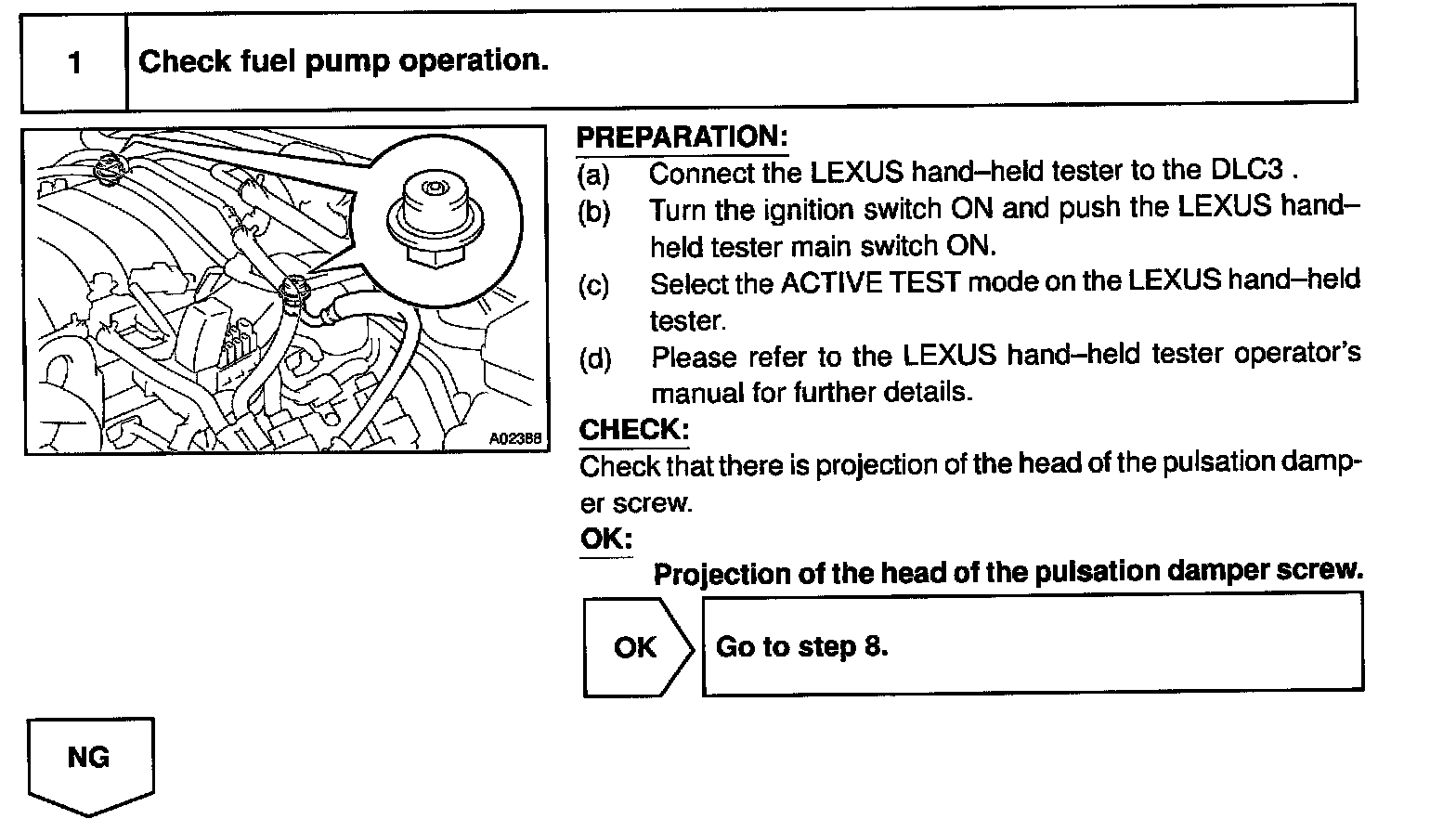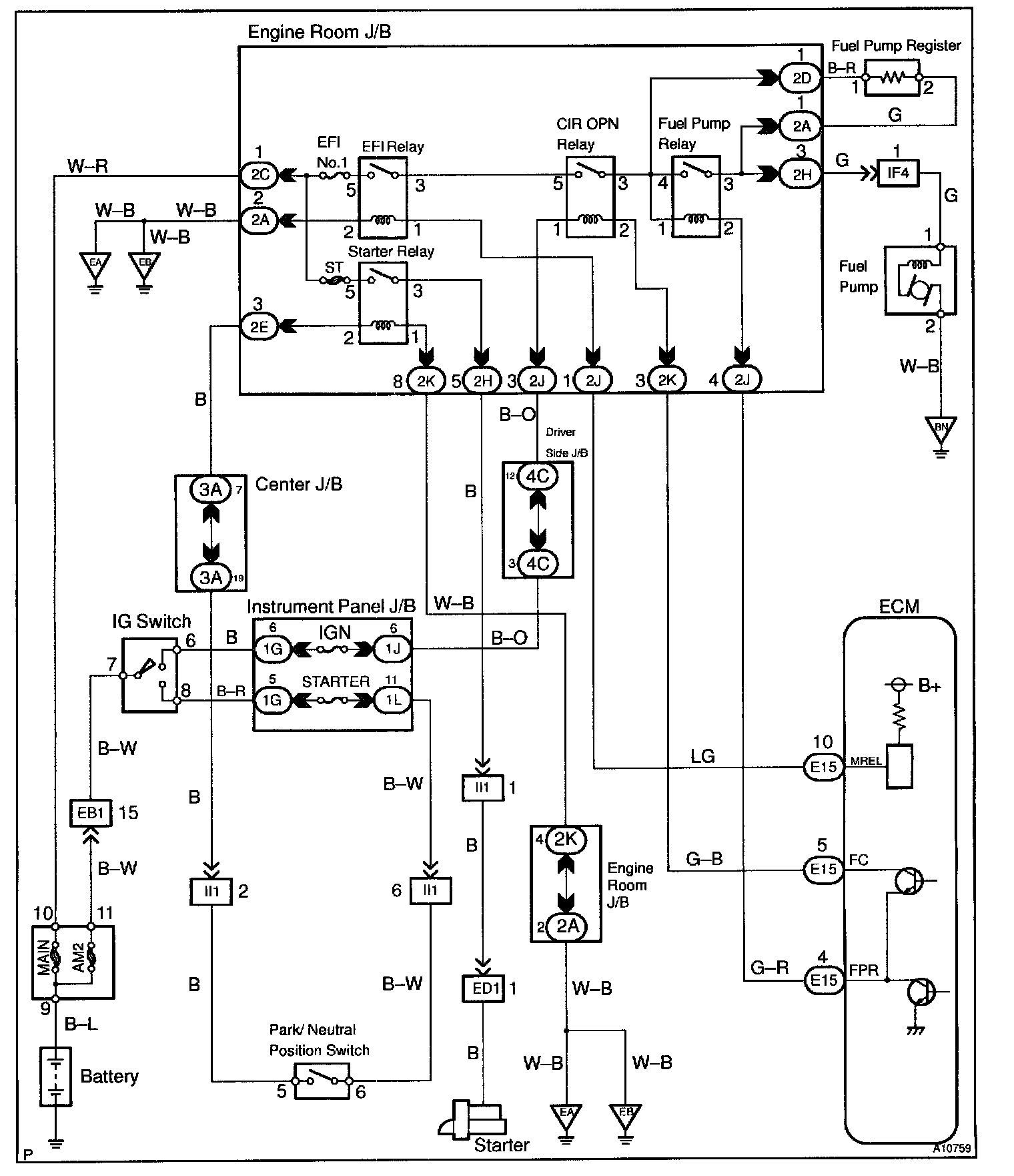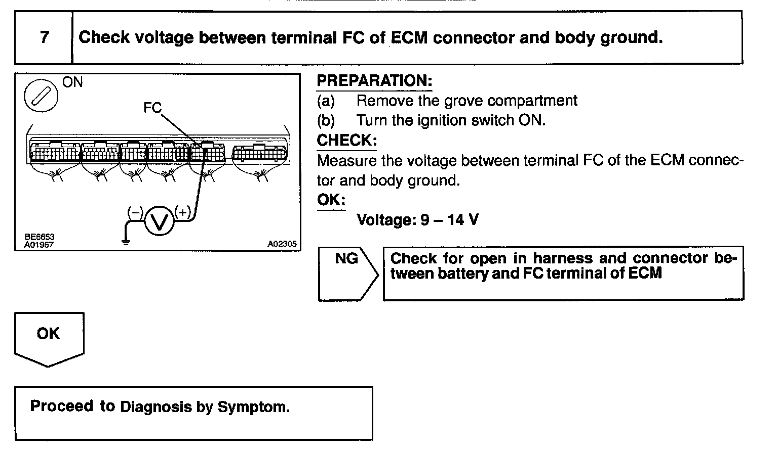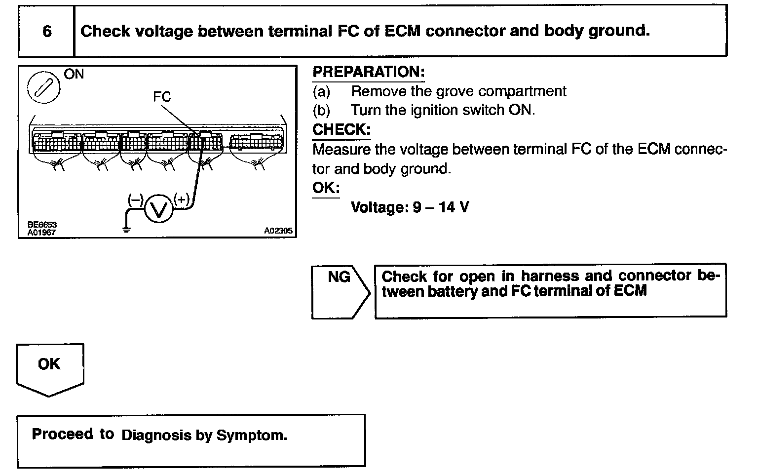 When the STA signal and NE signal are input to the ECM, Tr1 is turned ON, current flows to coil of the circuit opening relay, the relay switches on, power is supplied to the fuel pump and the fuel pump operates. While the NE signal is generated (engine running), the ECM keeps Tr1 ON (circuit opening relay ON) and the fuel pump also keeps operating.