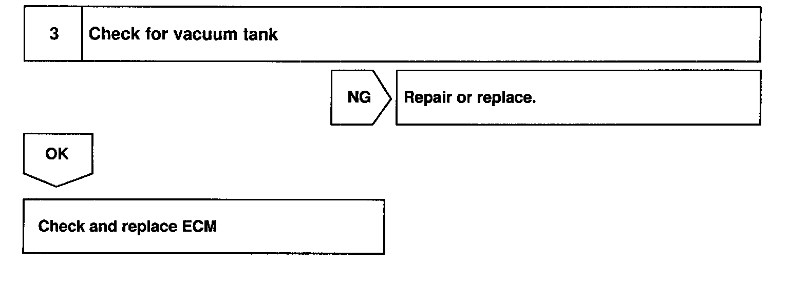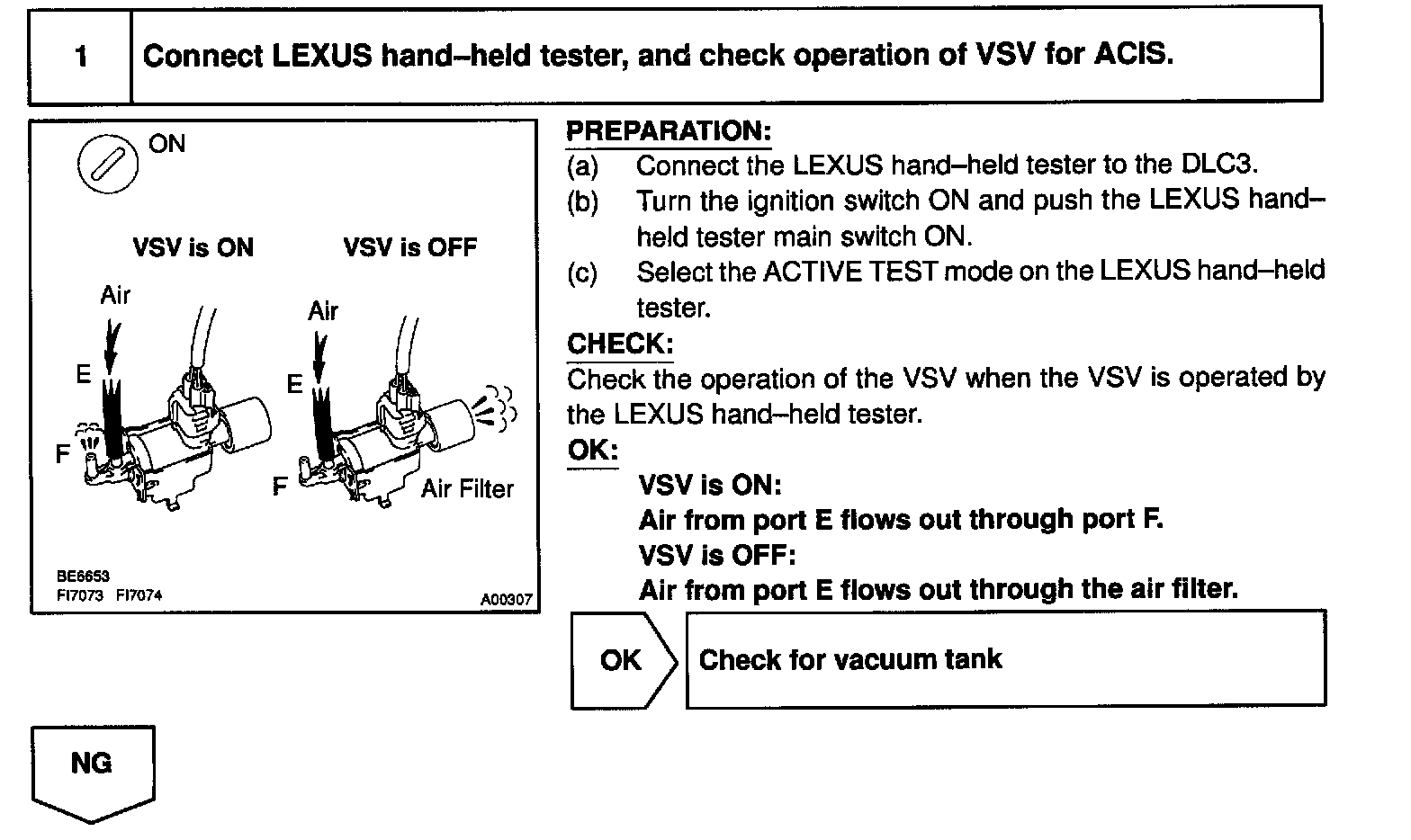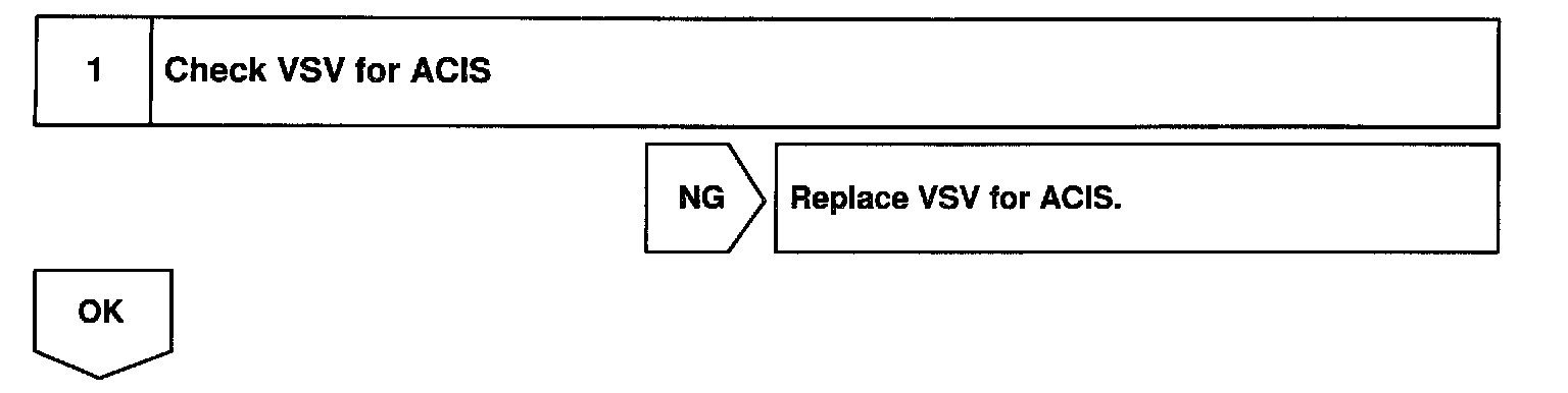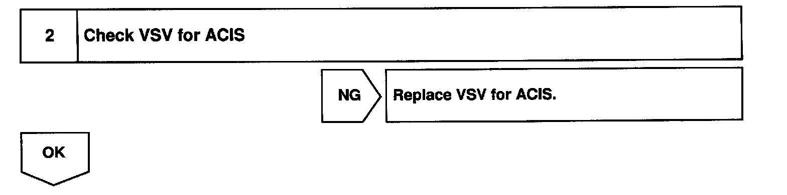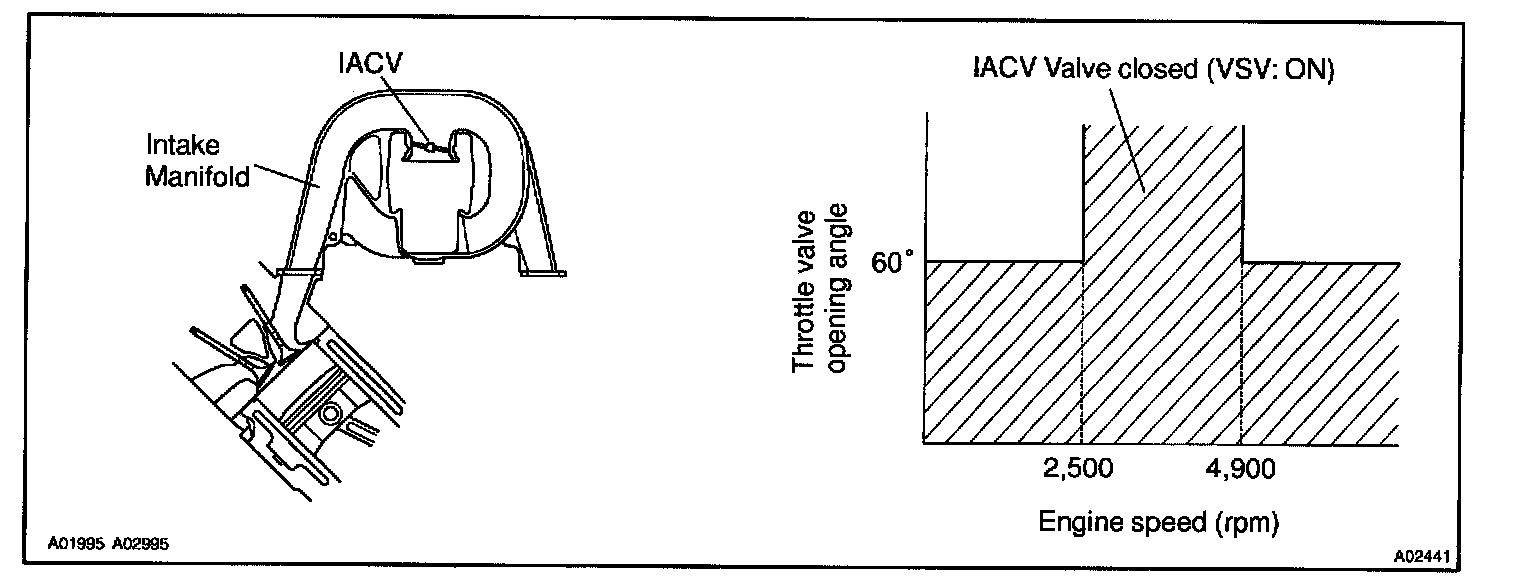 When the engine speed is 2,500 rpm or less, or 4,900 rpm or more and the throttle valve opening angle is 60 ° or more, the VSV is OFF, so the IACV is open. All the other times, the ECM turns the VSV ON and closes the IACV.