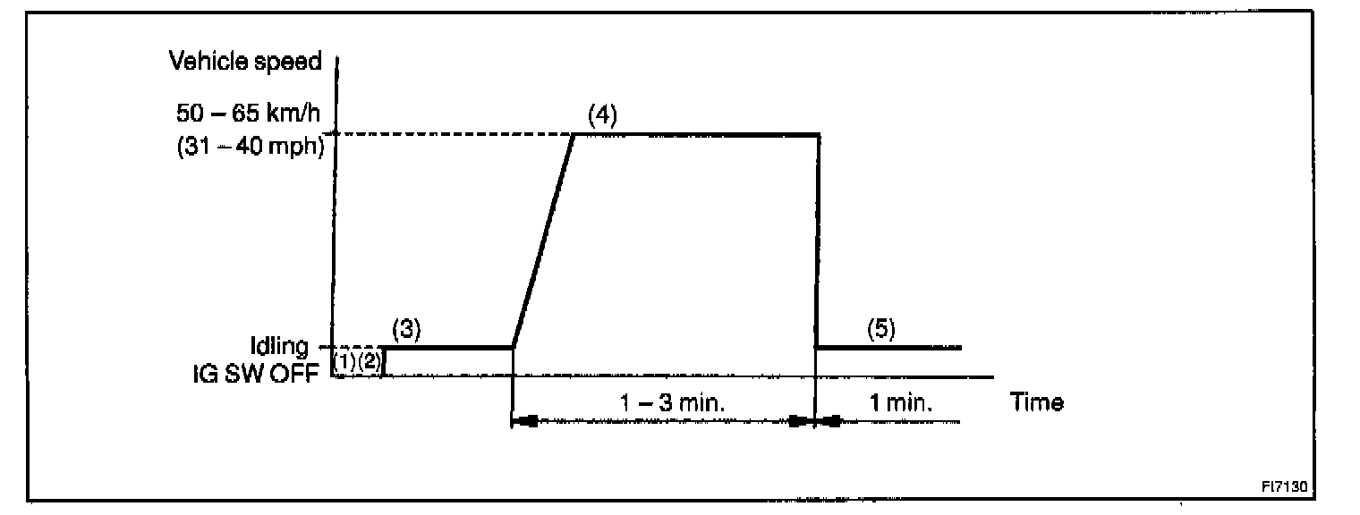4. Drive the vehicle at 50 - 65 kph (31 - 40 mph) for 1 - 3 min. to warm up the heated oxygen sensor.