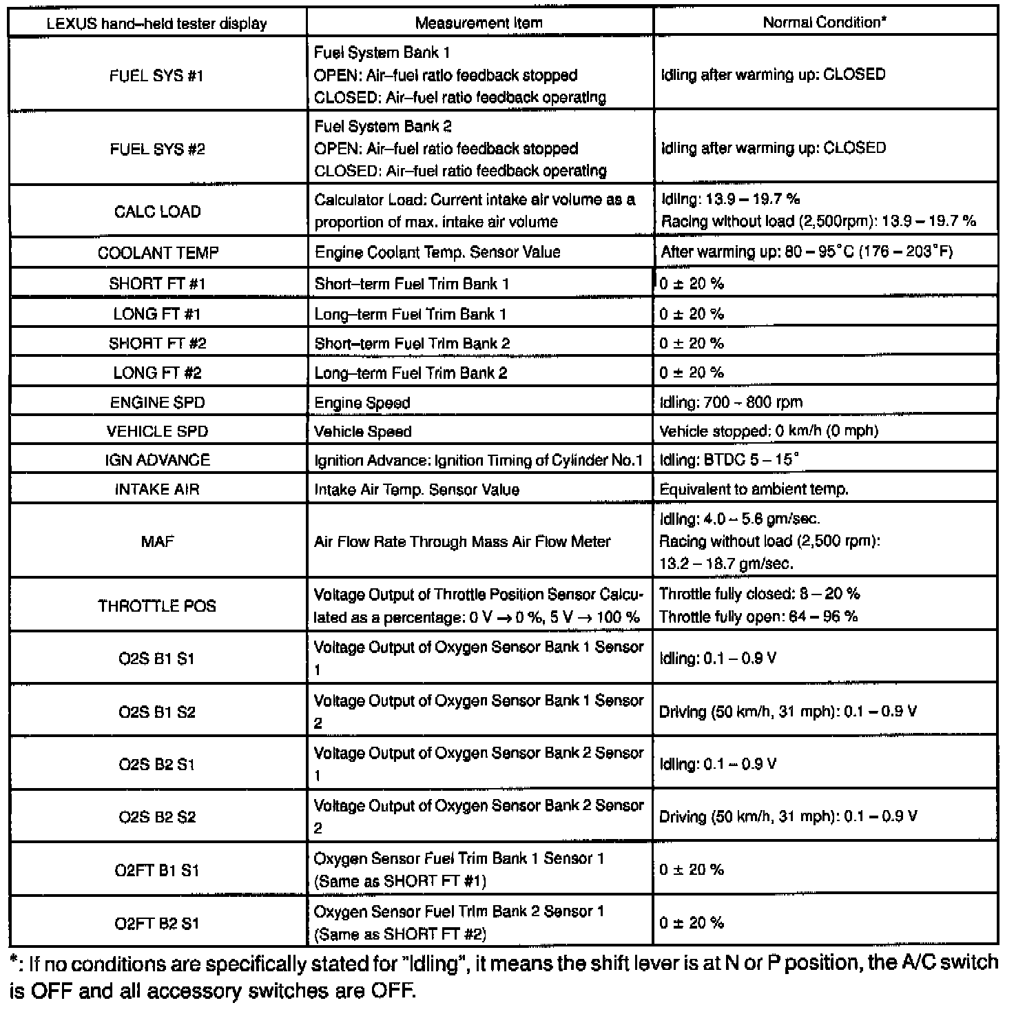 *: If no conditions are specifically stated for "idling", it means the shift lever is at N or P position, the A/C switch is OFF and all accessory switches are OFF.