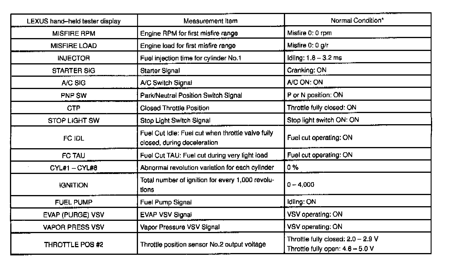 NOTE: The values given for "Normal Condition" are representative values, so a vehicle may still be normal even if its value varies from those listed here. So do not decide whether a part is faulty or not solely according to the "Normal Condition" here.a. CARB mandated signals.