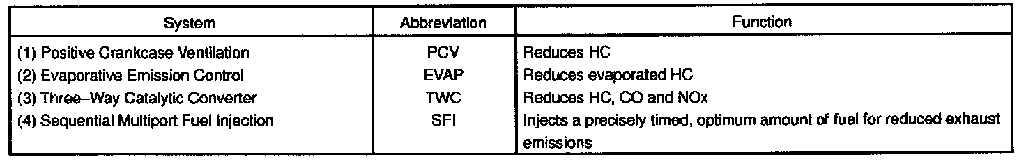 PURPOSEThe emission control Systems are installed to reduce the amount of HC, CO and NOx exhausted from the engine ((3) and (4)), to prevent the atmospheric release of blow-by gas-containing HC (1) and evaporated fuel containing HC being released from the fuel tank (2).