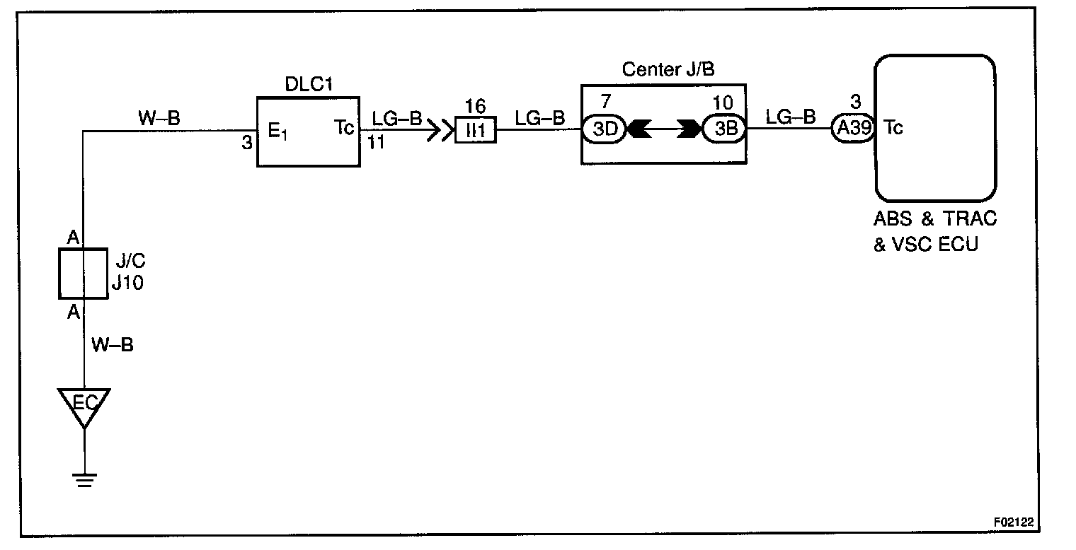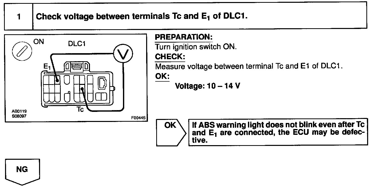 Connecting terminals Tc and E1 of the DLC1 causes the ECU to display the DTC by flashing the ABS warning light.