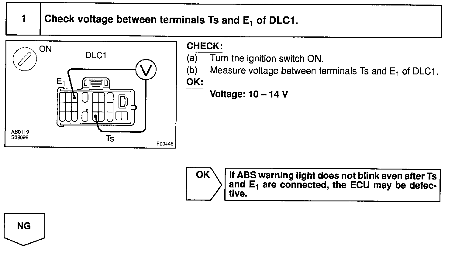 Connecting terminals Ts and E1 of the DLC1 in the engine compartment starts the check.